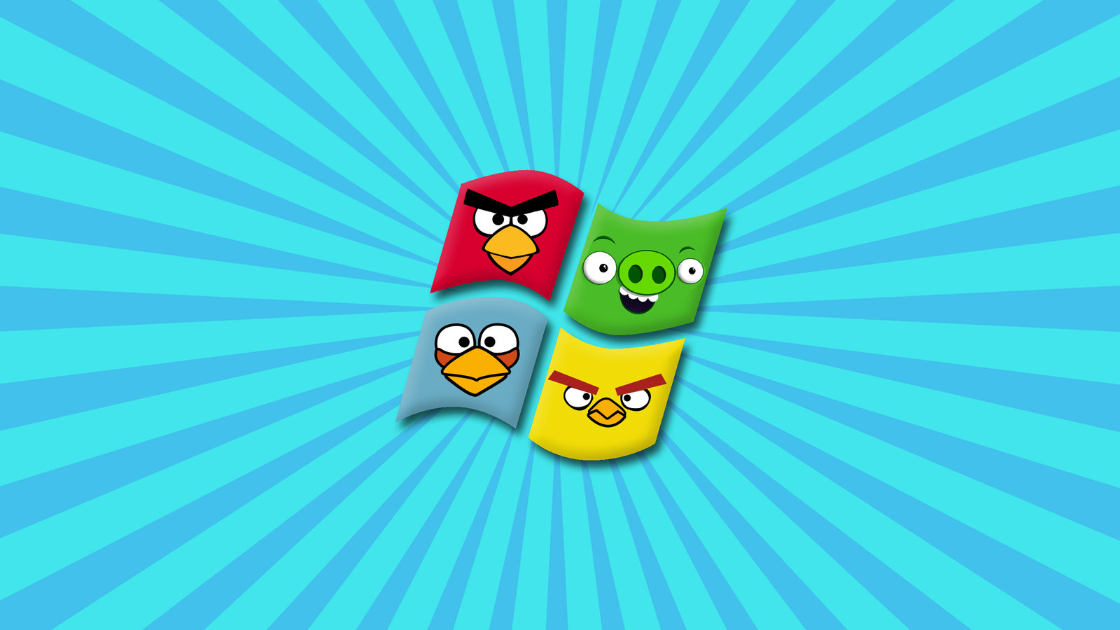 Description: A group of angry birds sitting on top of a blue background with a sunburst in the background.