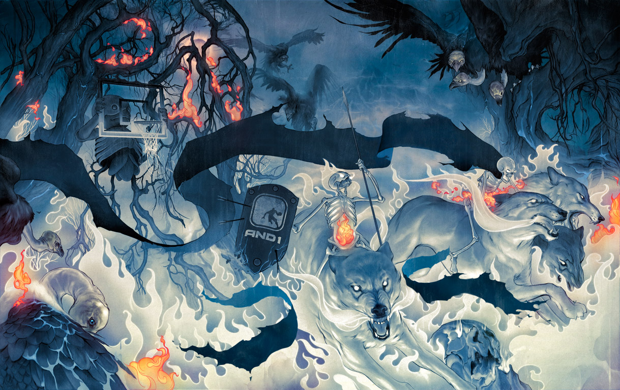 Description: A painting of a group of animals in a forest with fire and smoke coming out of their mouths and a house in the background.