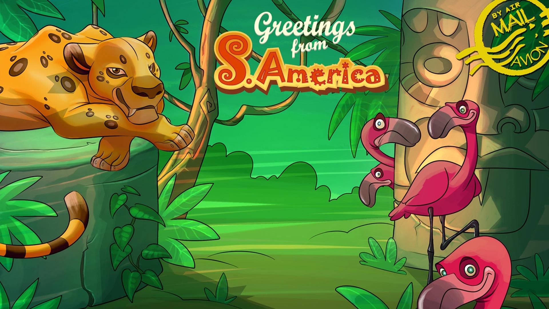 Description: A group of animals standing in a forest next to a tree and a sign that says greetings from san antonio.