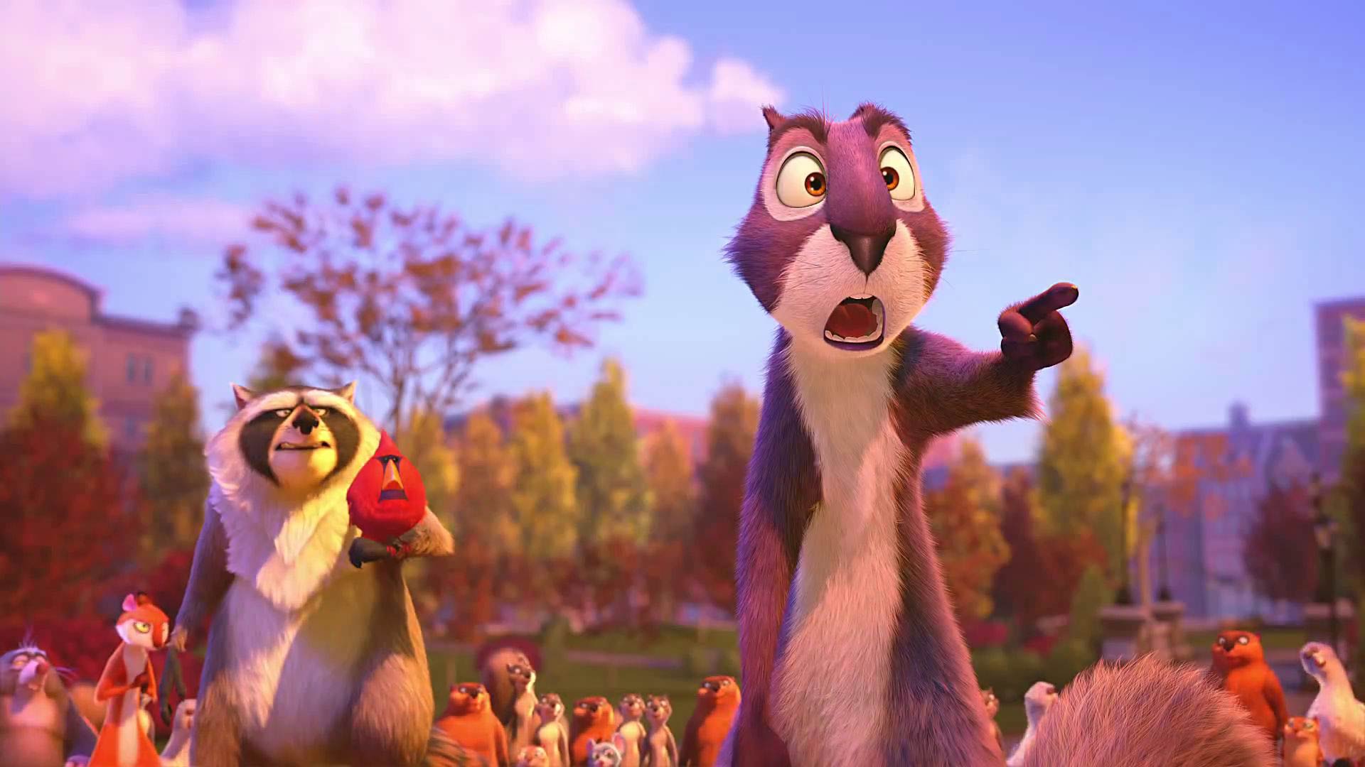 Description: A group of animated animals standing next to each other on a field of grass and trees in the background.