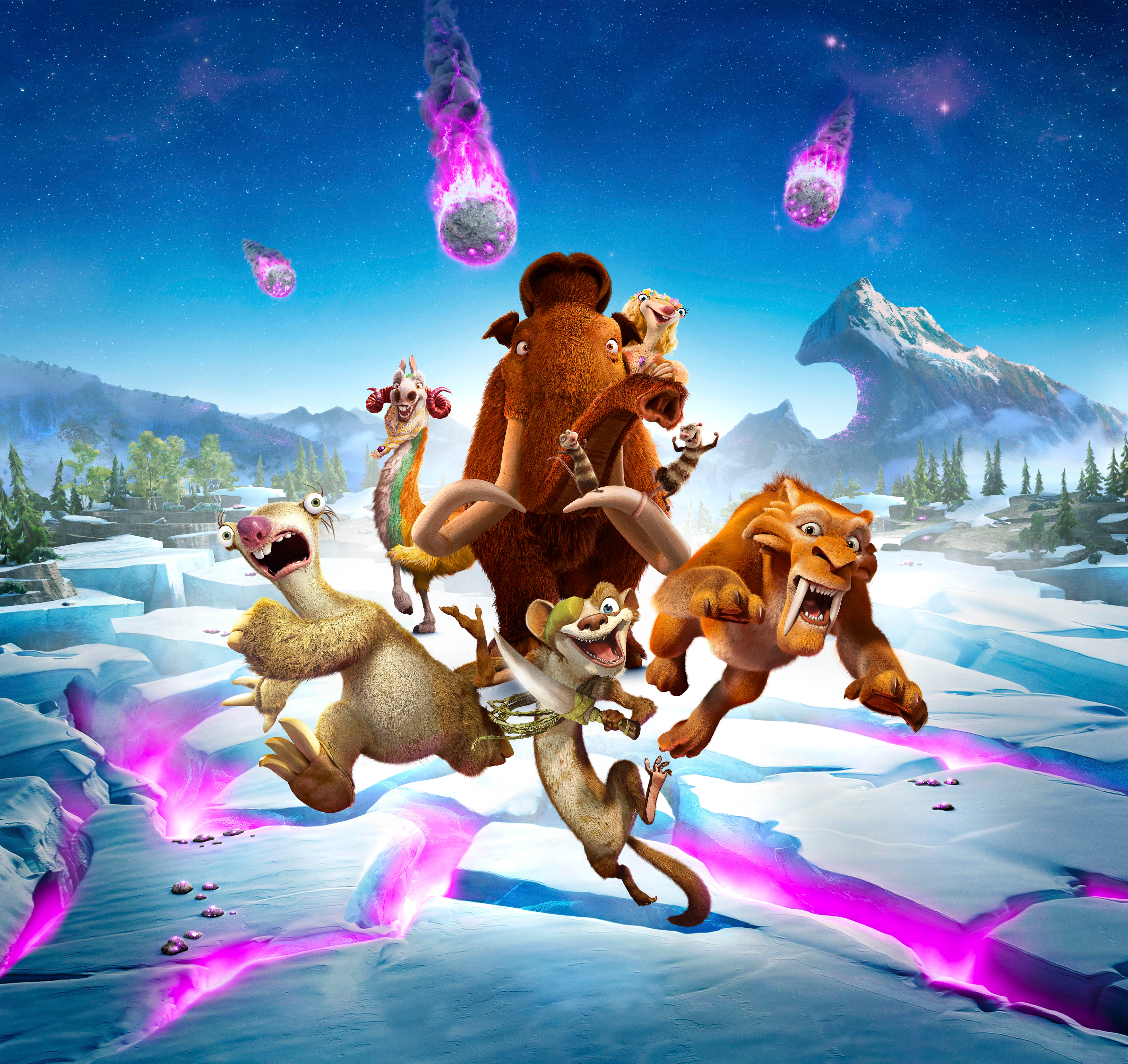 Description: A group of animated animals running across a snow covered field with mountains in the background and a sky filled with stars.