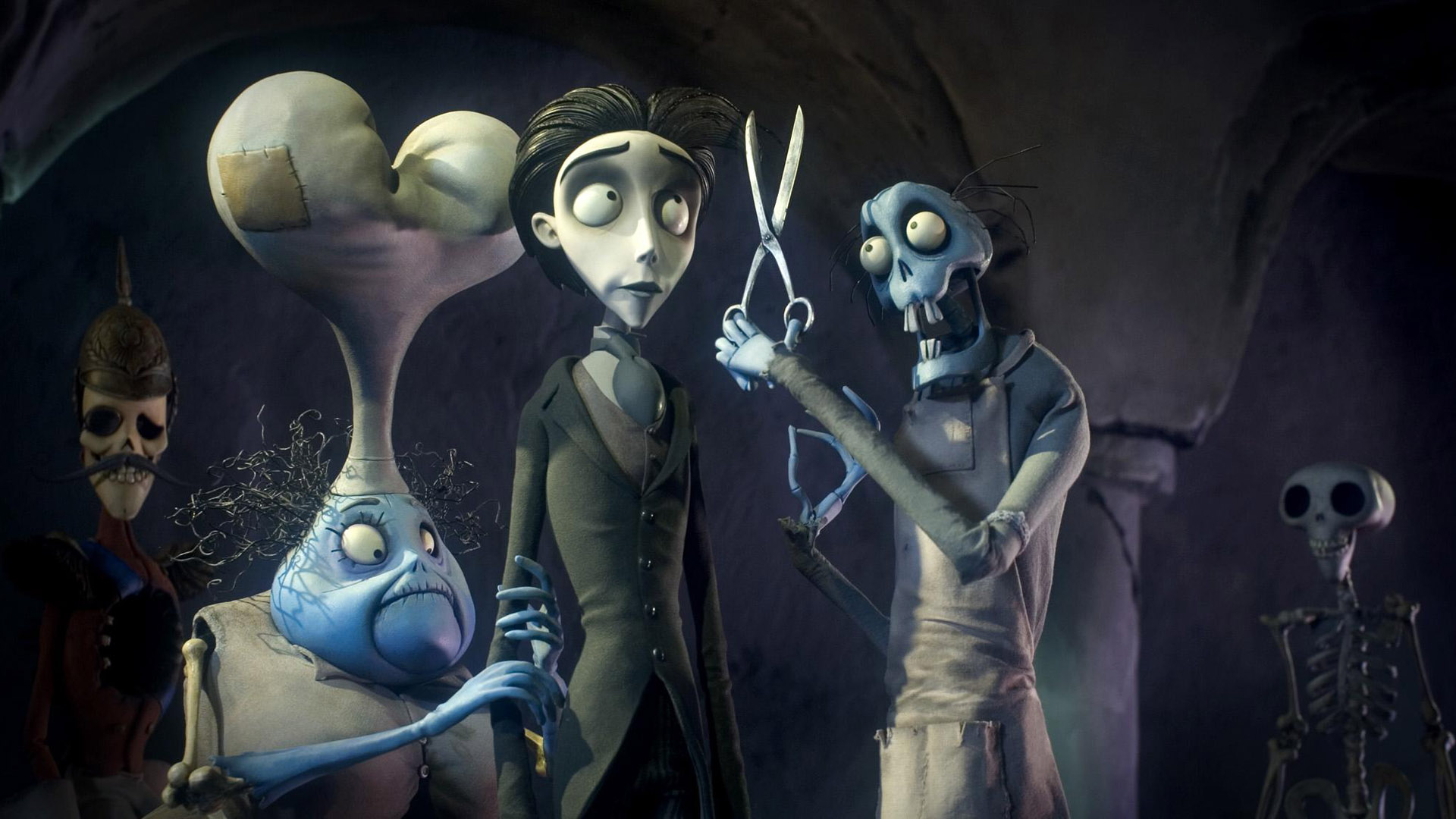 Description: A group of animated characters standing in a cave with a giant egg in the middle of the scene and a man holding a pair of scissors.