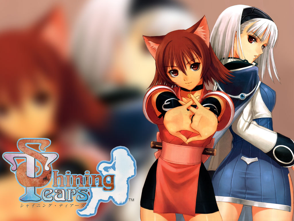 Description: Two anime characters are standing next to each other in front of a background of other characters and a cat.