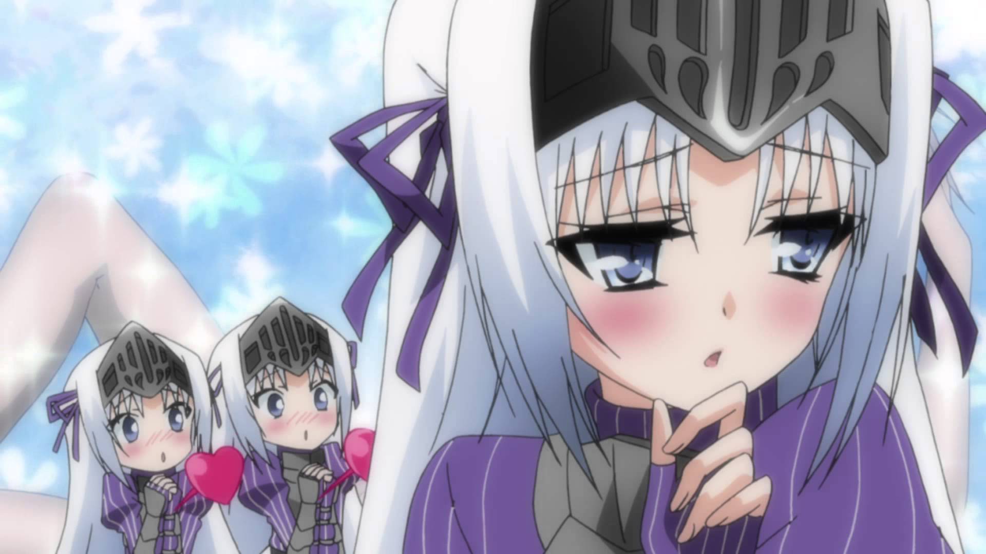 Description: A anime character with long white hair and blue eyes and a purple outfit with a black hat and a purple bow.