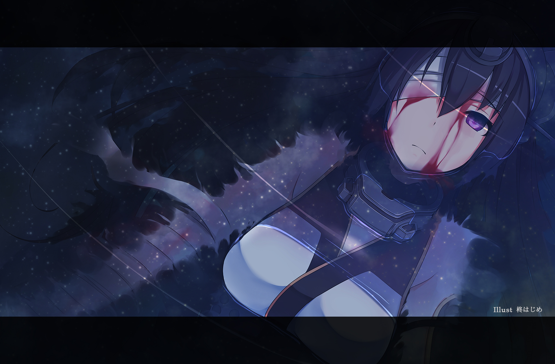 Description: A anime character with a black hair and blue eyes and a white shirt and black gloves and a black background.
