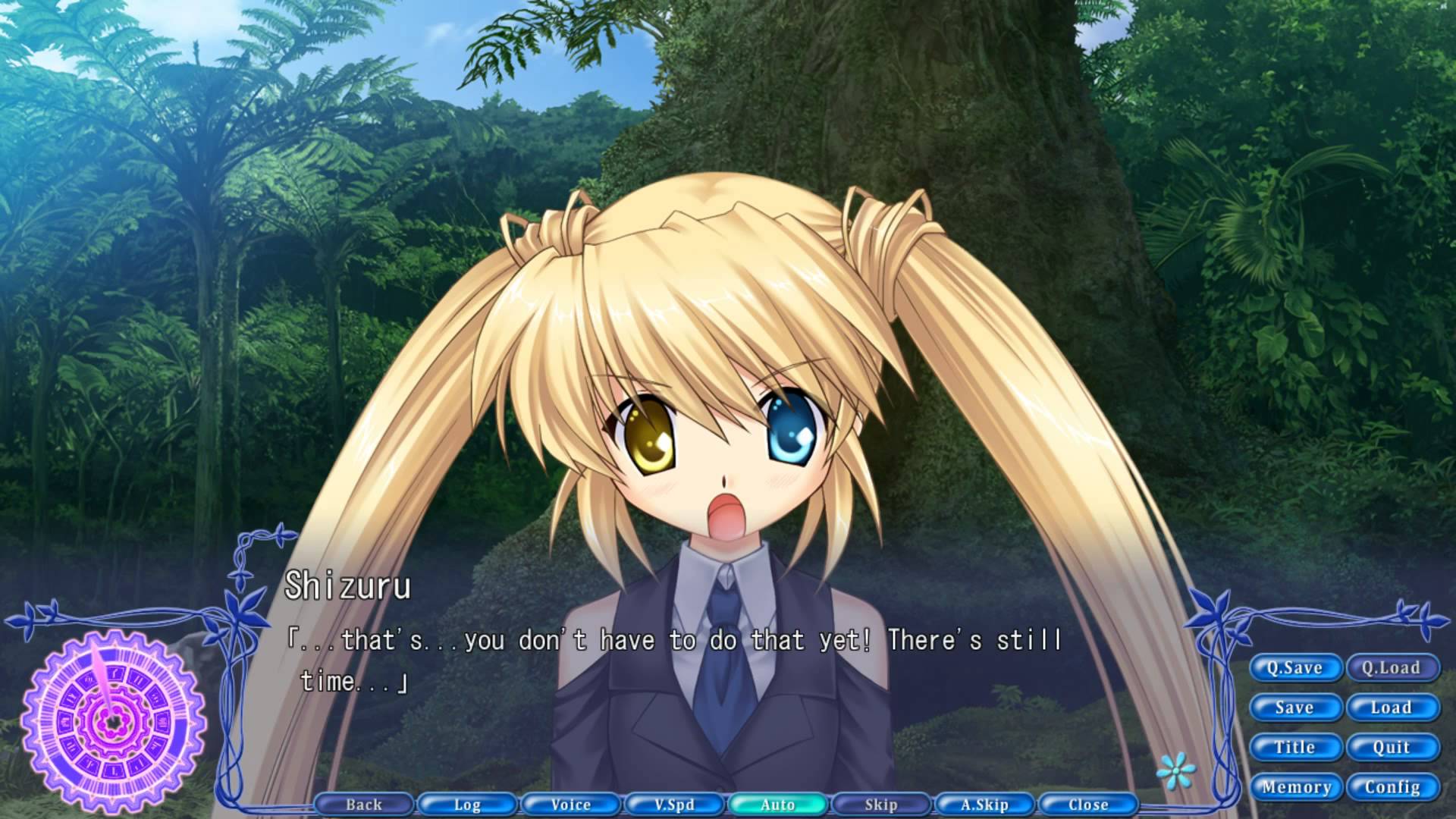 Description: A anime character with blonde hair and blue eyes in a forest setting with a tree and a purple circular object.