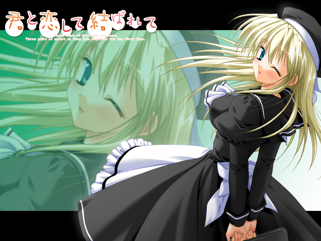 Description: A anime character with long blonde hair and a black dress and a white shirt and black hat and a black purse.