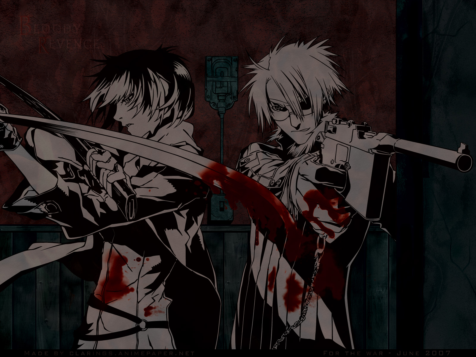 Description: Two anime characters with bloody hands holding swords and blood on the floor of a building with a door in the background.