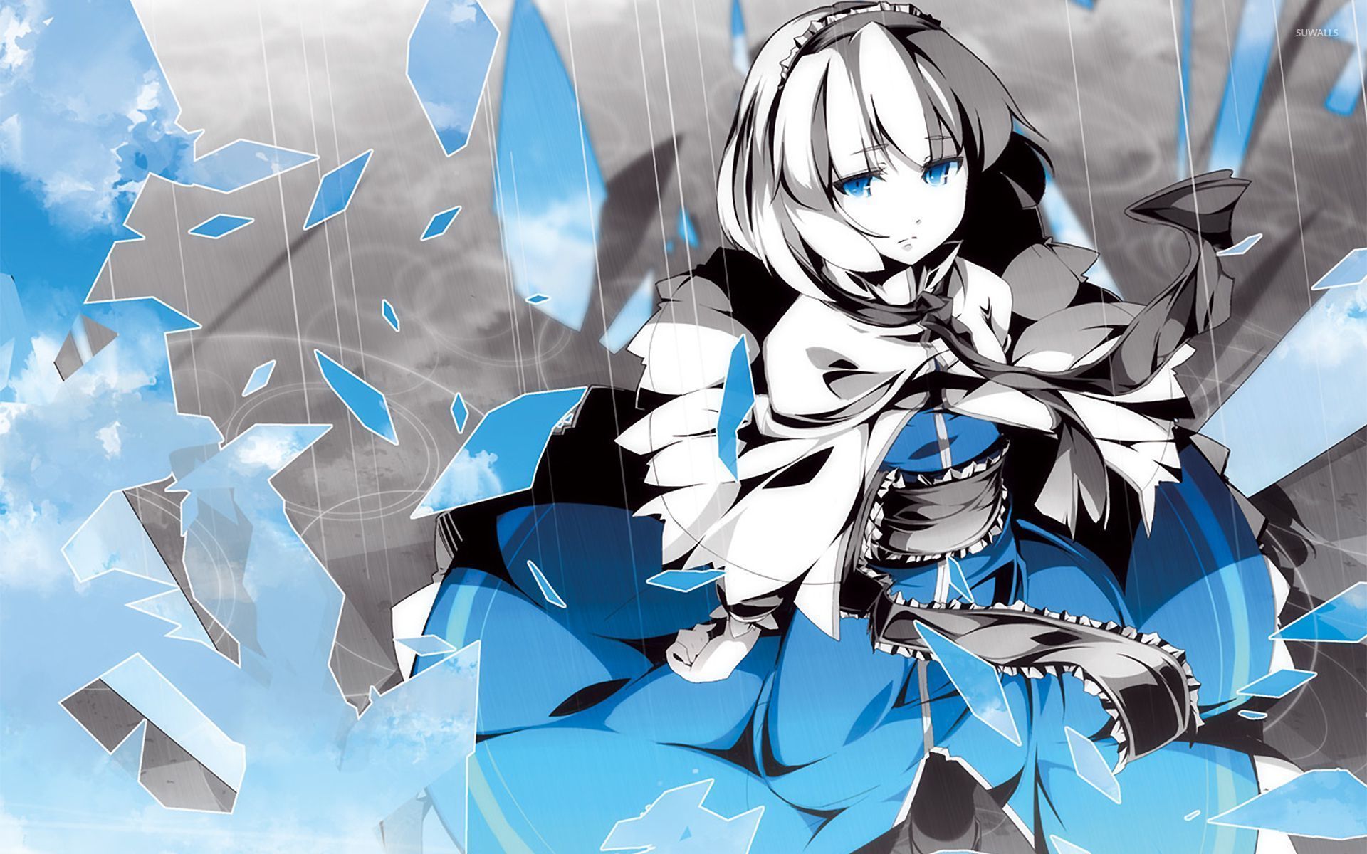 Description: A anime character with a blue outfit and a white hair and a blue background with a blue and white design.