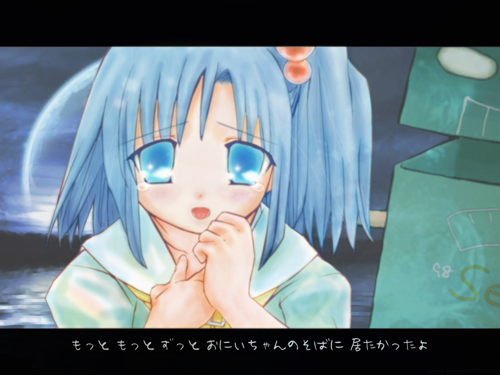 Description: A anime character with blue hair and blue eyes is looking at something in the distance with her hands on her chin.