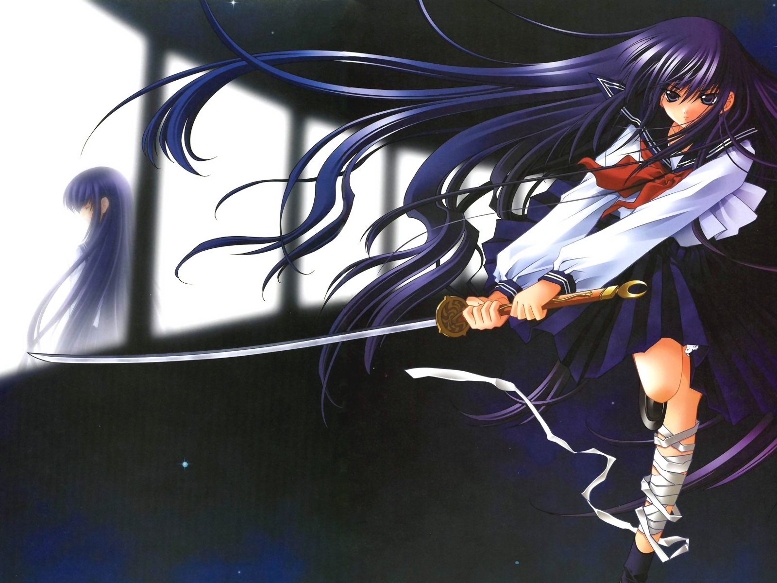 Description: A anime character with long hair holding a sword and a sword in her hand.