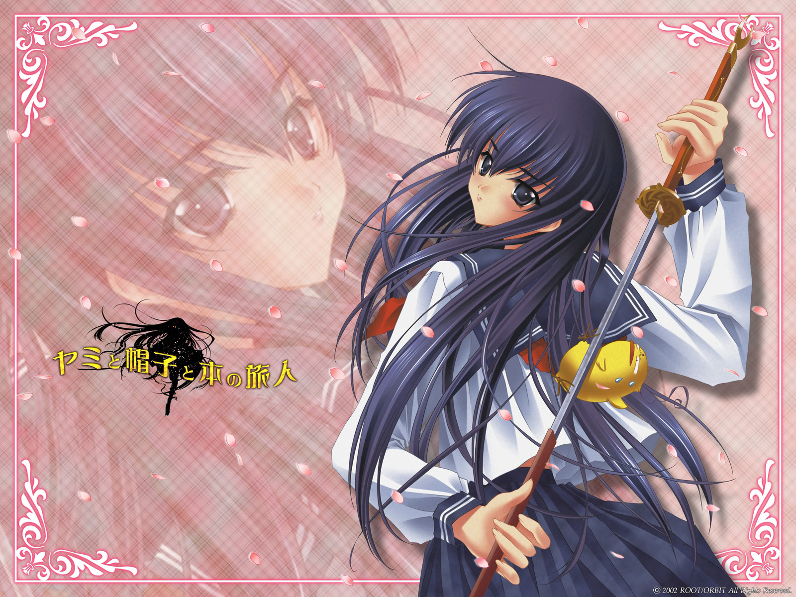 Description: A anime character holding a sword and a sword in her hand with a pink background and a pink frame.