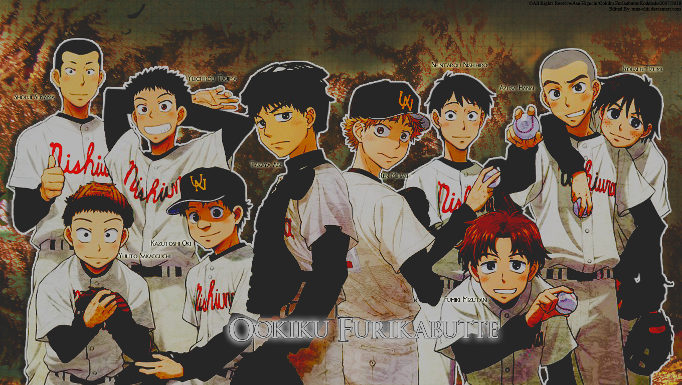 Description: A group of anime boys with baseball uniforms on posing for a picture together with a baseball bat in their hand.