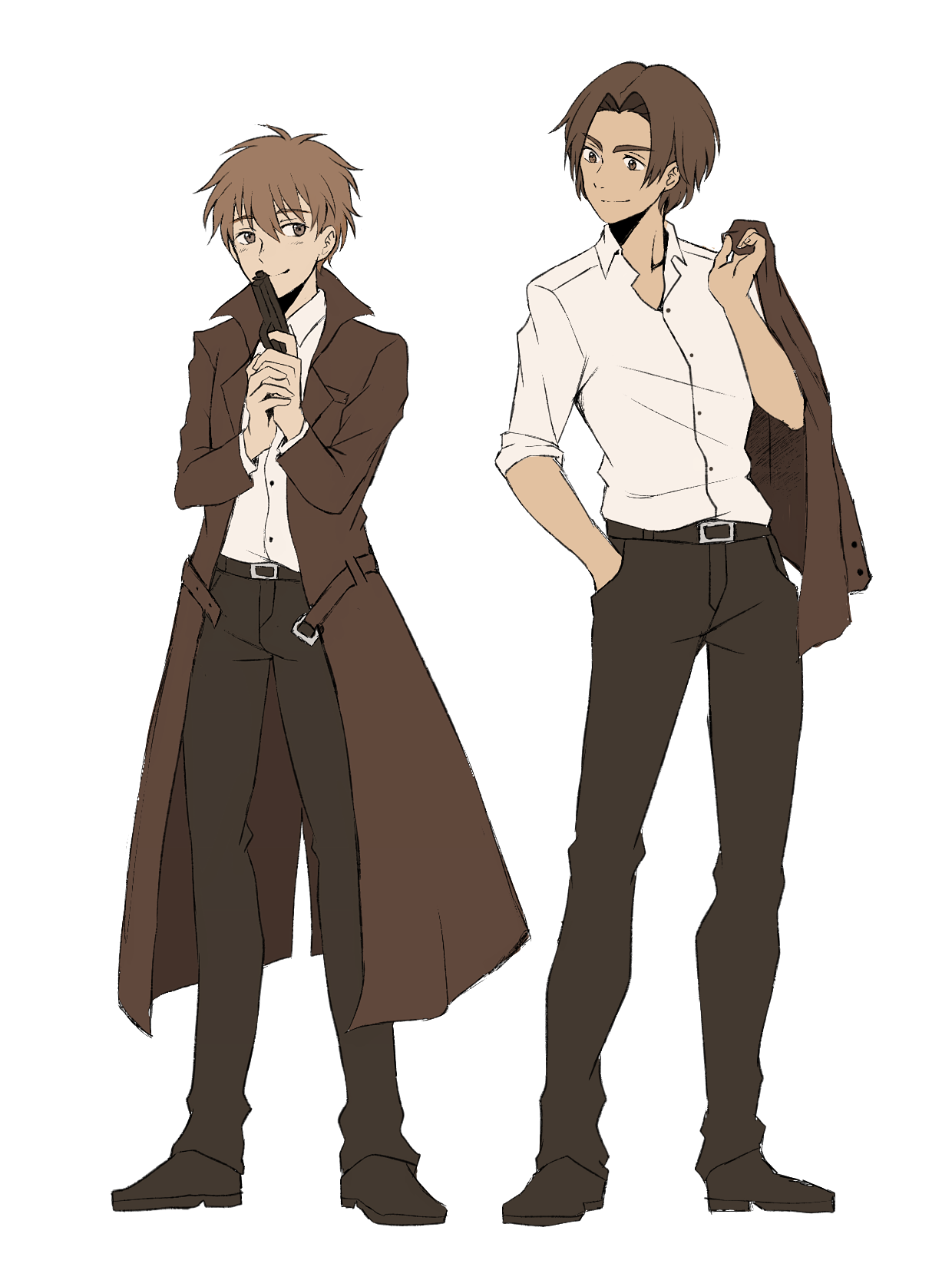 Description: Two anime characters standing next to each other with their hands on their hipss and one holding a microphone.