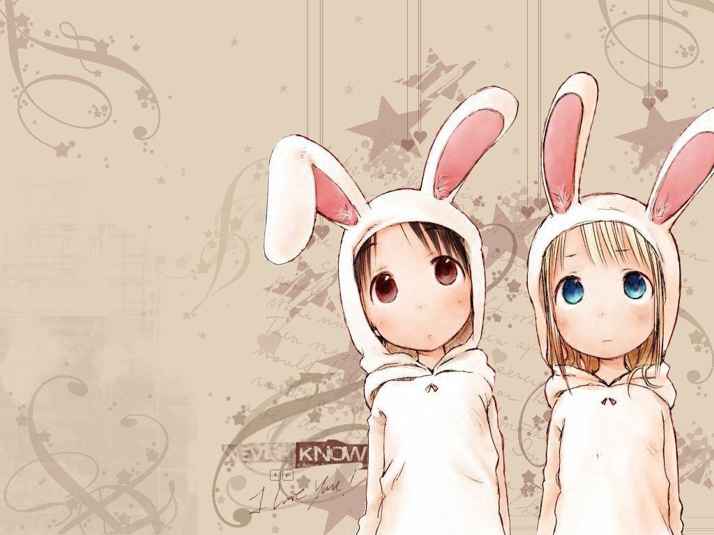 Description: Two anime characters wearing bunny ears and dresses with a background of music notes and stars and a grungy design.