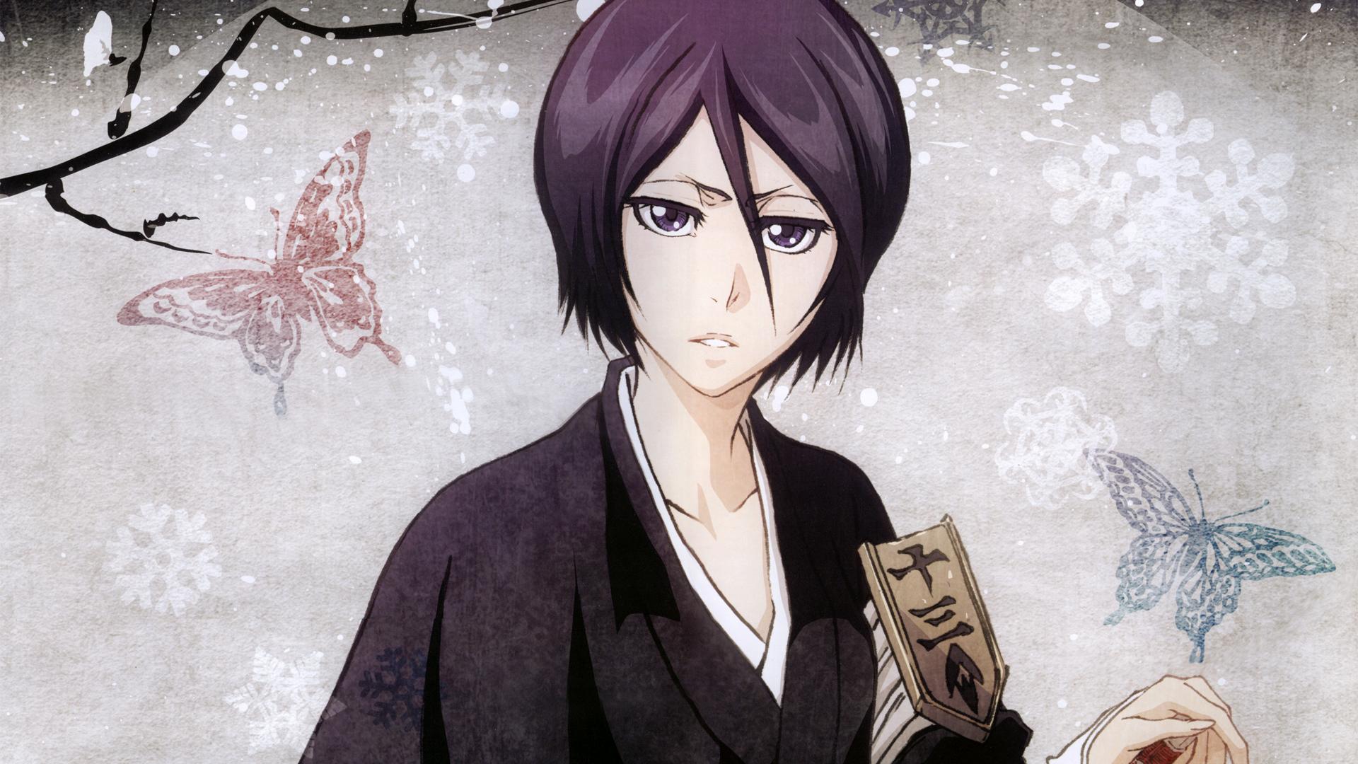Description: A anime character holding a book and a butterfly on a tree branch in the background with butterflies flying around.
