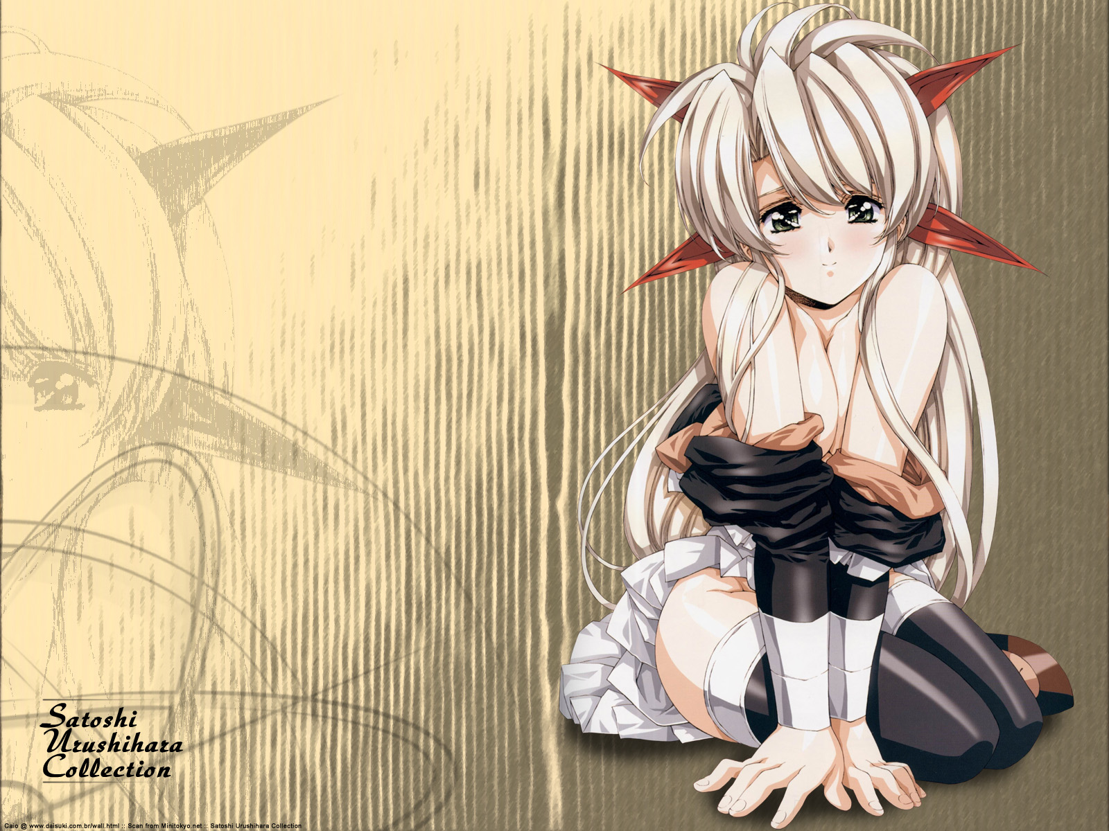 Description: A anime character sitting on the ground with her hands on her knees and a demon head on her head.