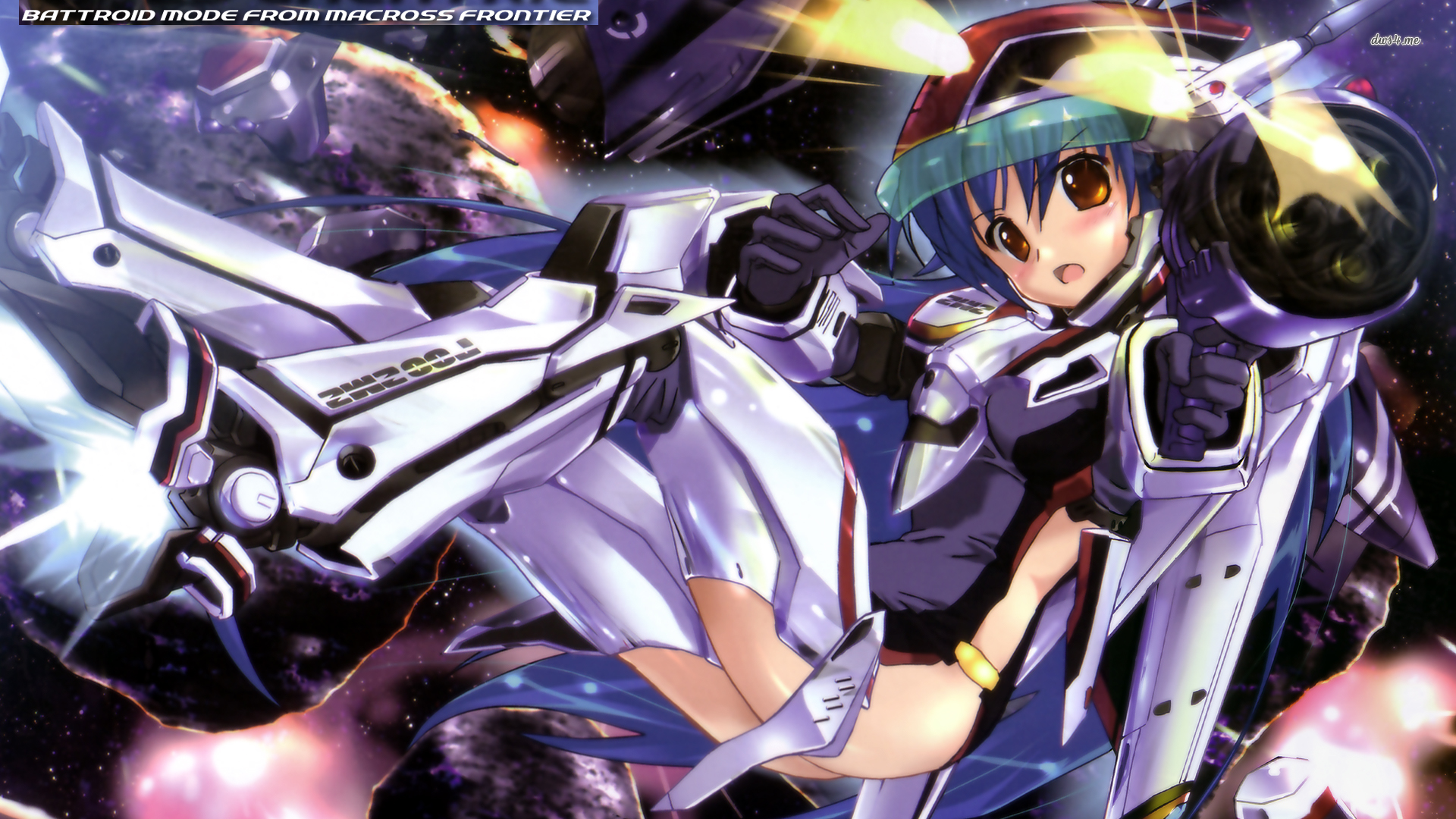 Description: A anime character is flying through space with a gun in her hand and a helmet on her head.