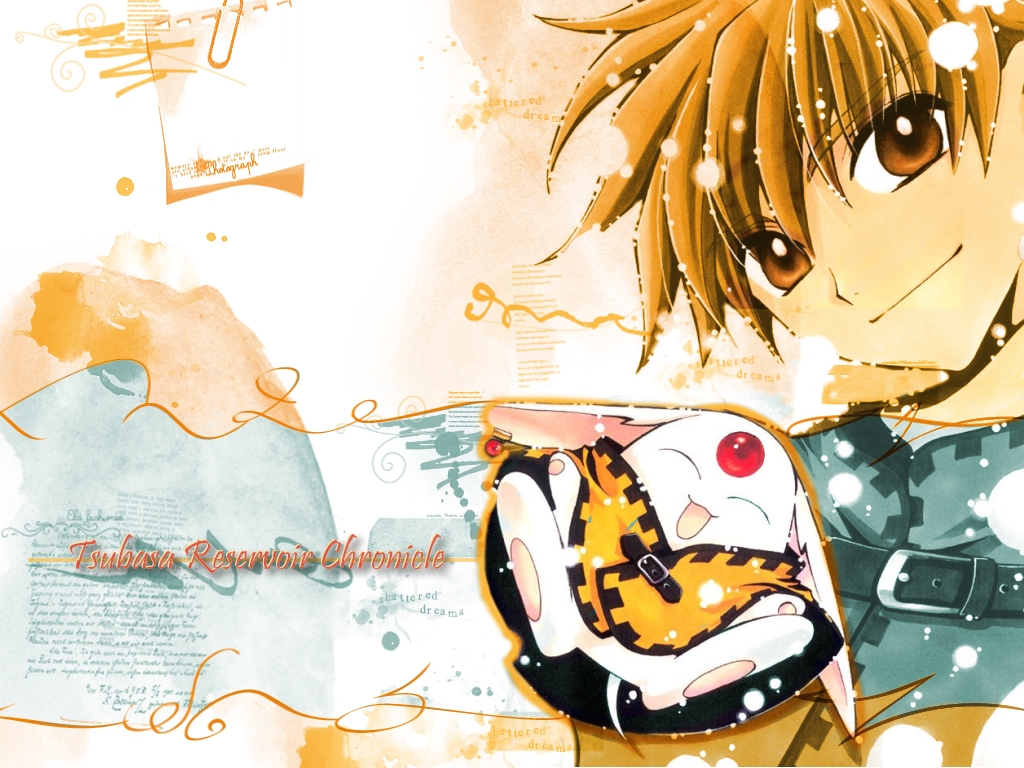 Description: A anime character with a hat and a backpack on his shoulder and a background with a pattern of watercolors.