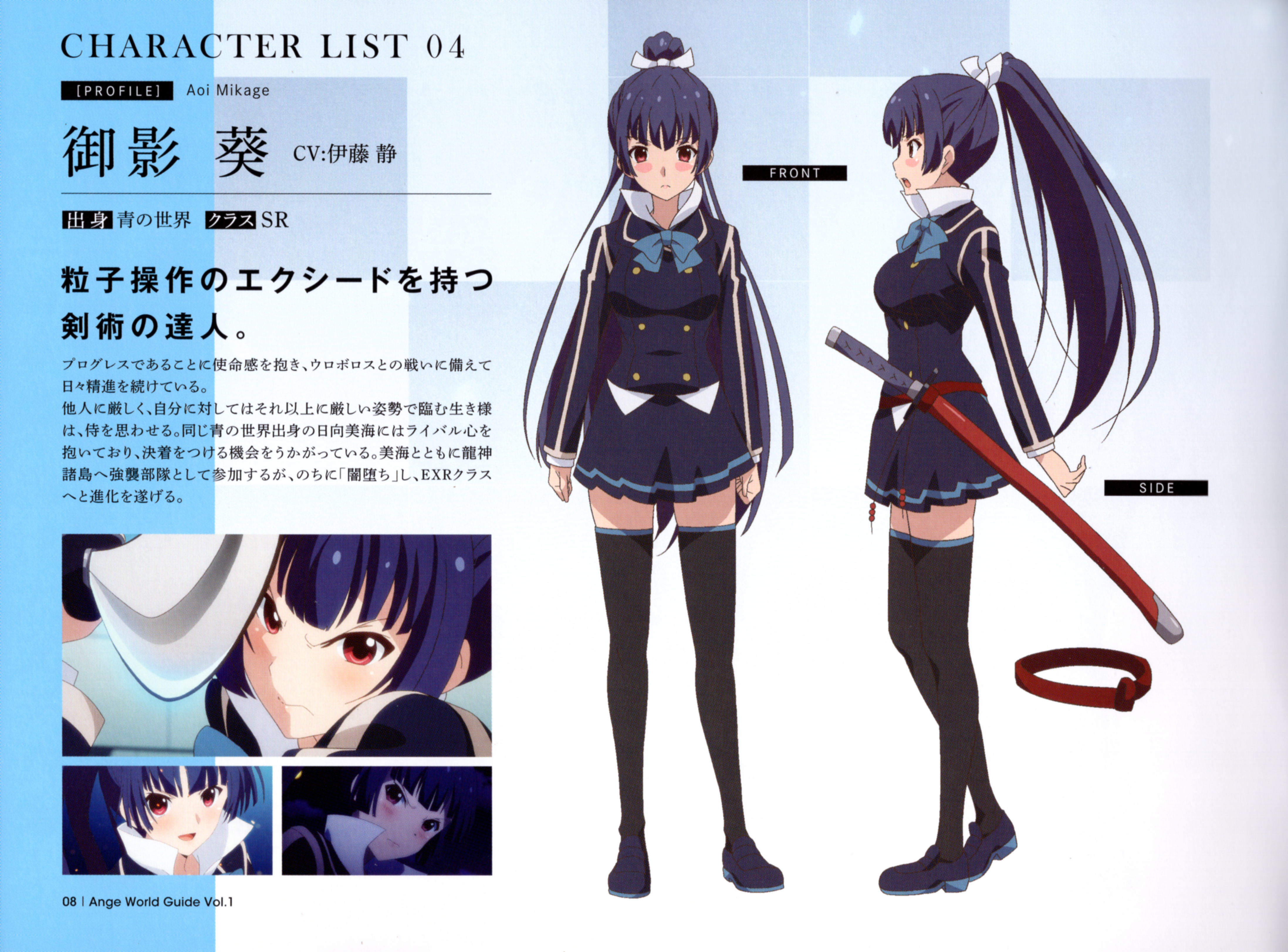 Description: A character list for a anime character with long hair and a sword in her hand.