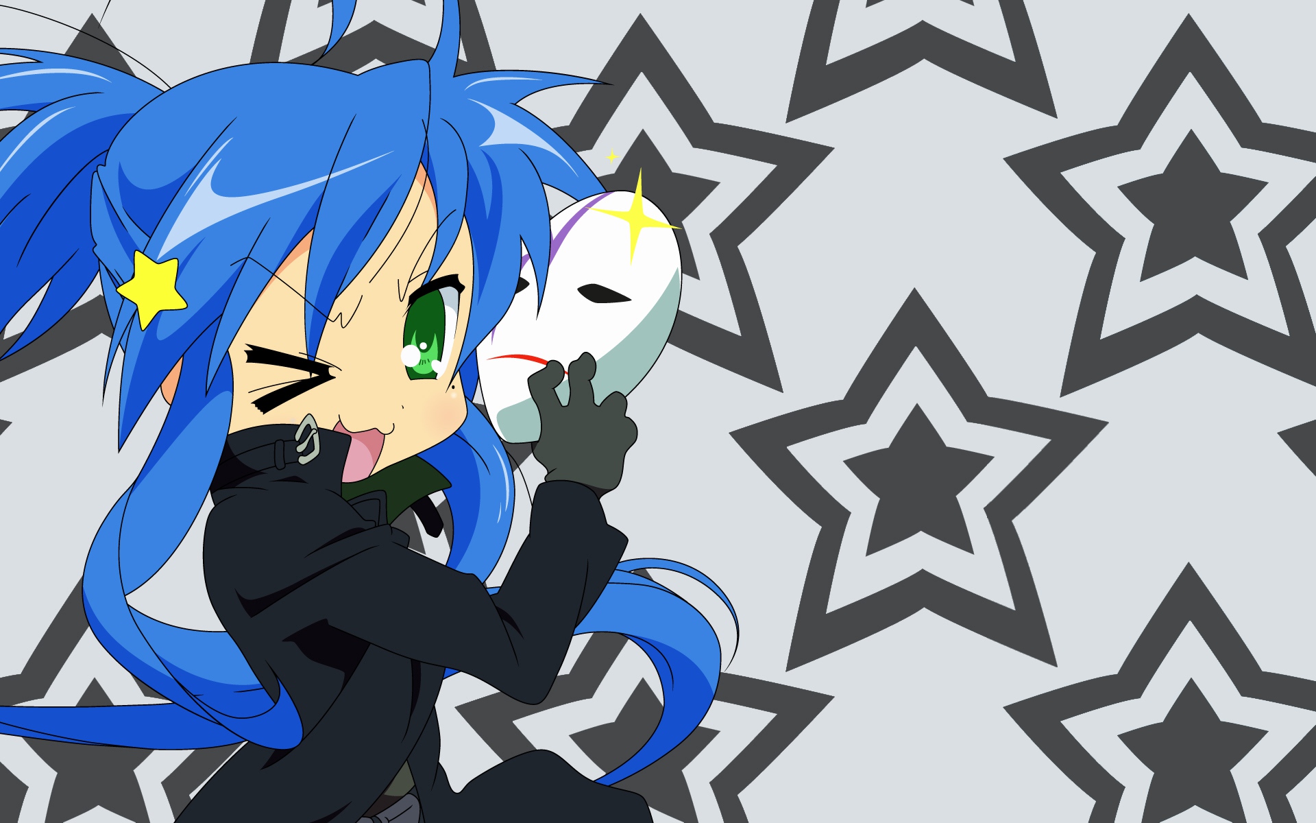 Description: A anime character holding a mirror in her hand and looking at it with a surprised look on her face.