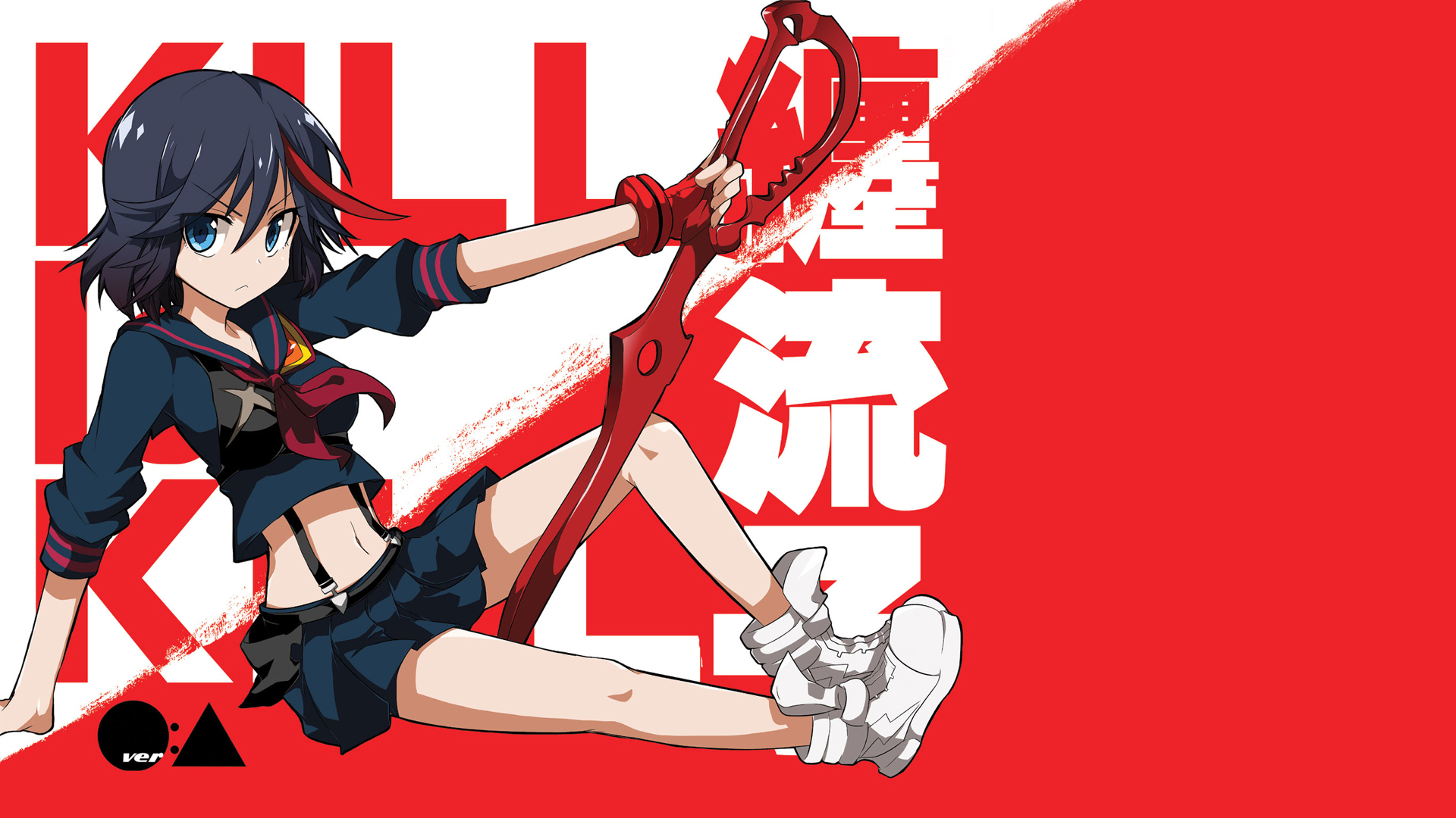 Description: A anime character with a scissor in her hand and a red background with white letters and a red background.