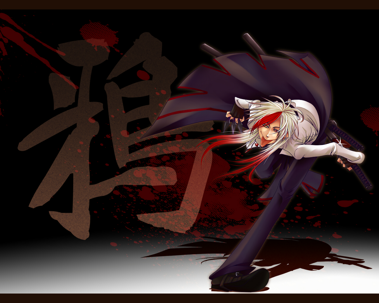 Description: A anime character with a sword in her hand and blood splatters all around her body and head.
