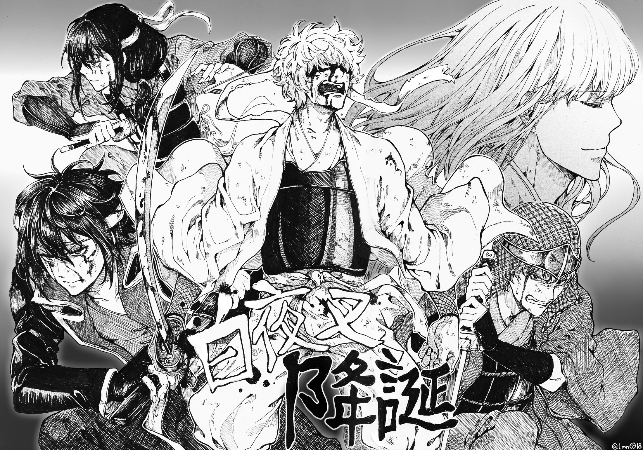 Description: A group of anime characters with a black and white background and a black and white background with the words.