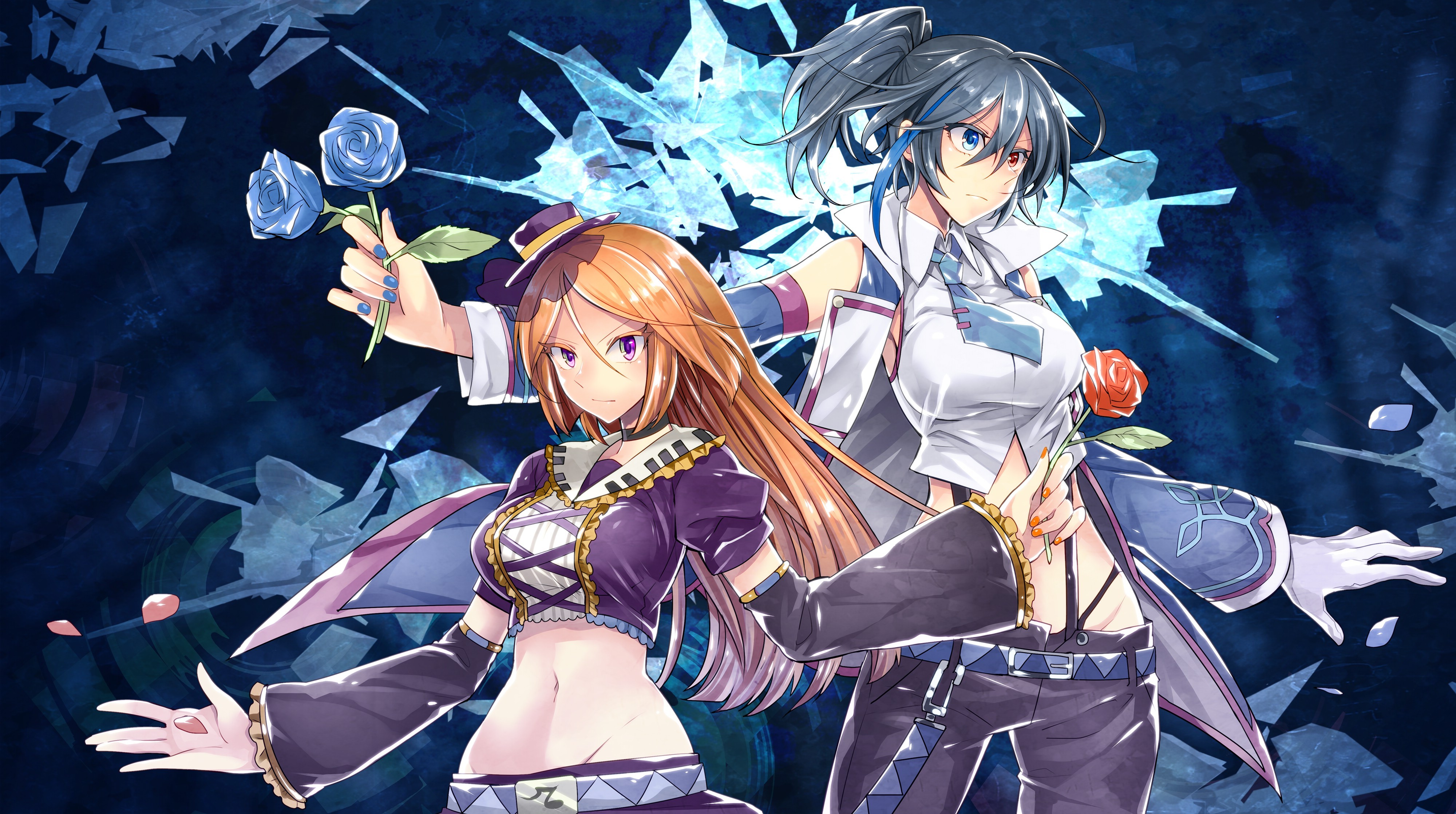 Description: Two anime characters standing next to each other in front of a blue background with broken glass and flowers on it.