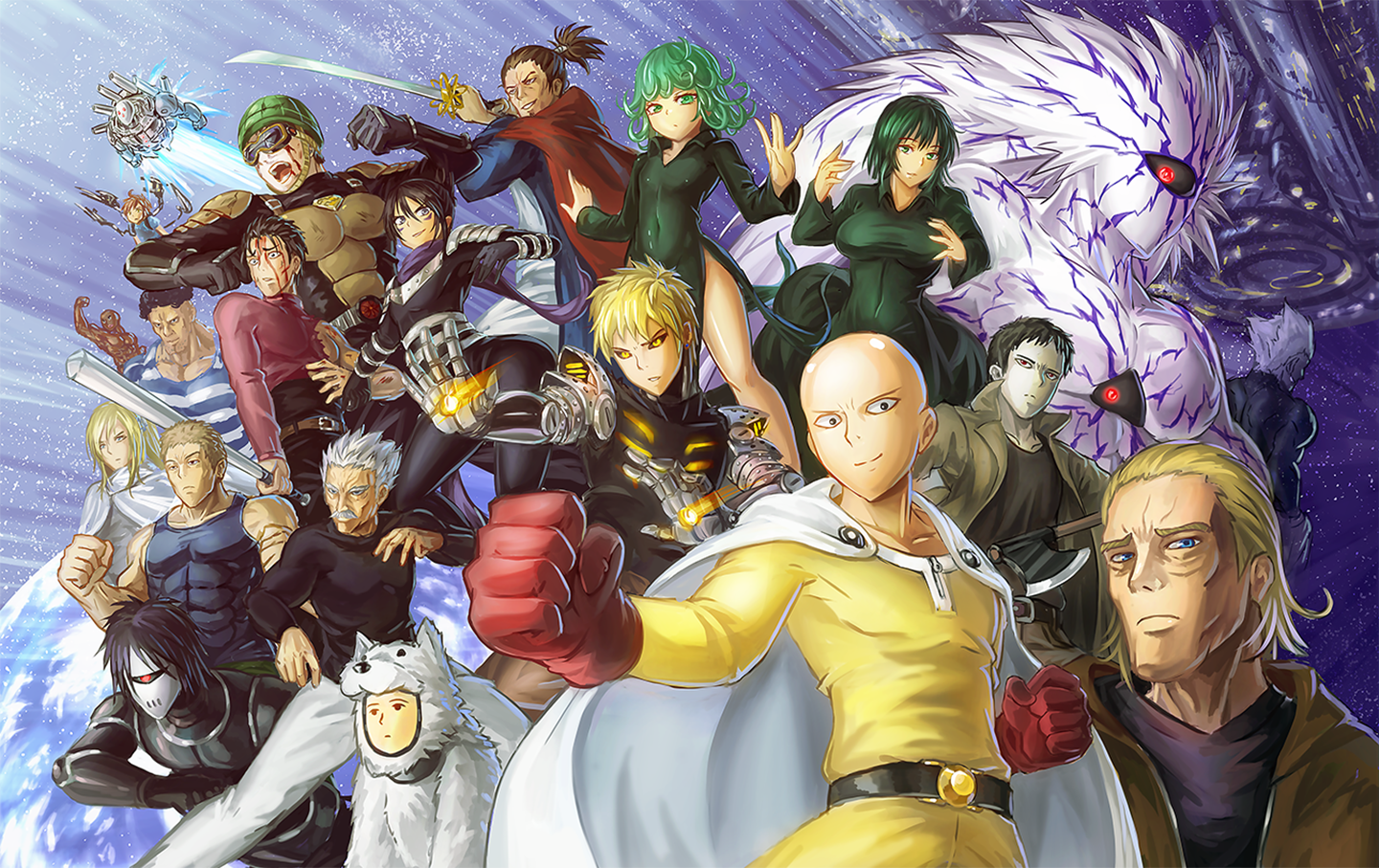 Description: A group of anime characters standing in front of a blue background with a purple background and a blue sky.
