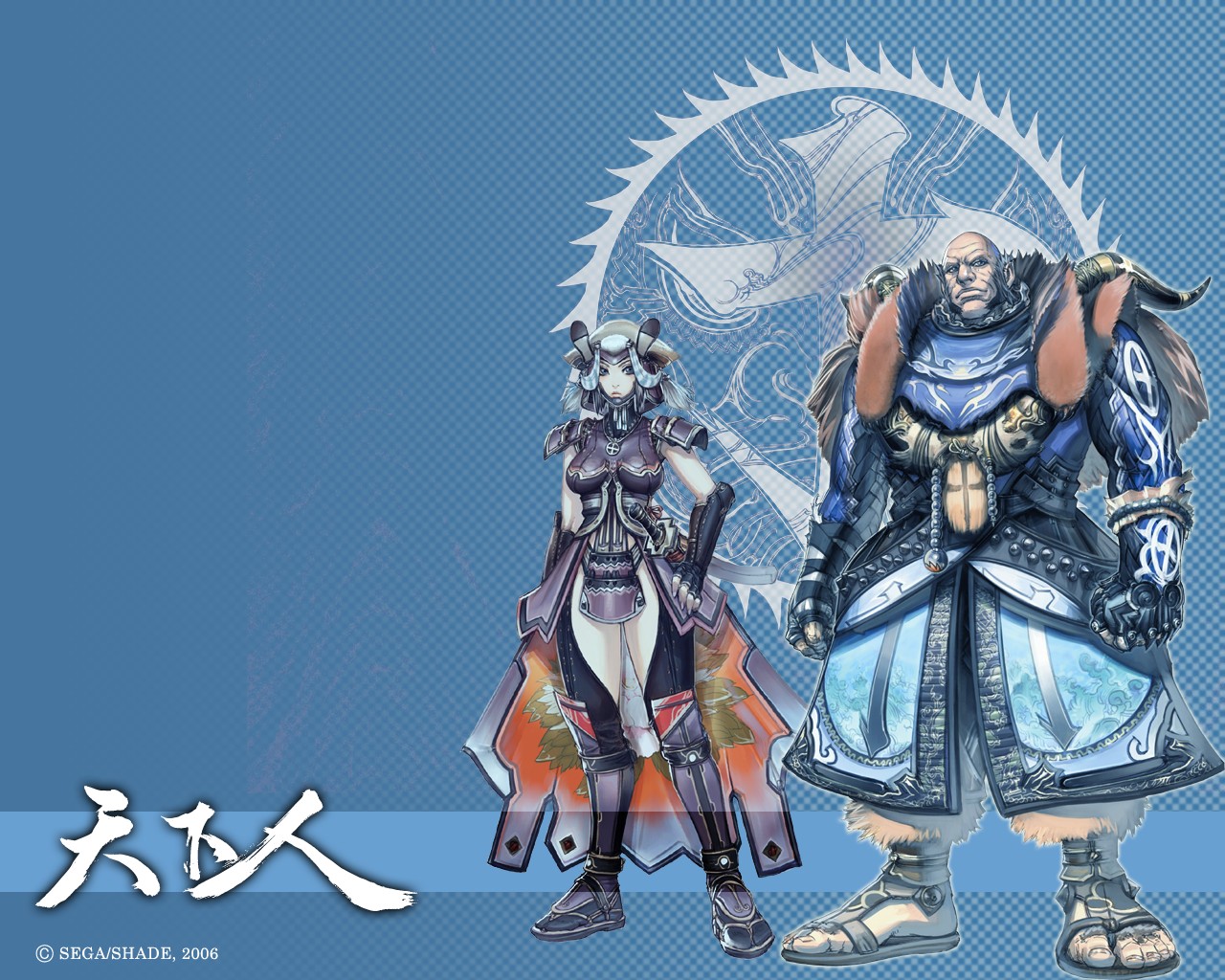 Description: A couple of anime characters standing next to each other on a blue background with a white circle in the middle.