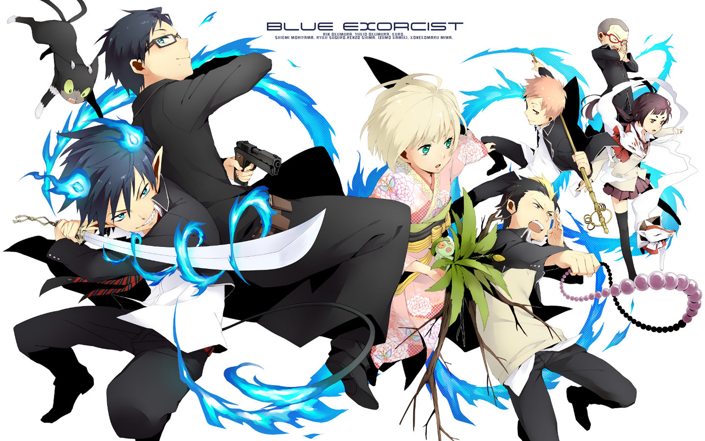 Description: A group of anime characters with blue exoquisit on their backs and arms in the air.