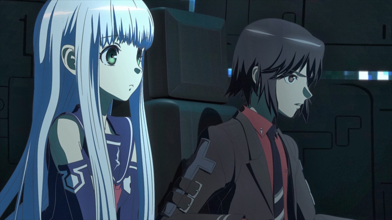 Description: Two anime characters standing next to each other in a room with a black background and a blue - haired girl with long white hair.