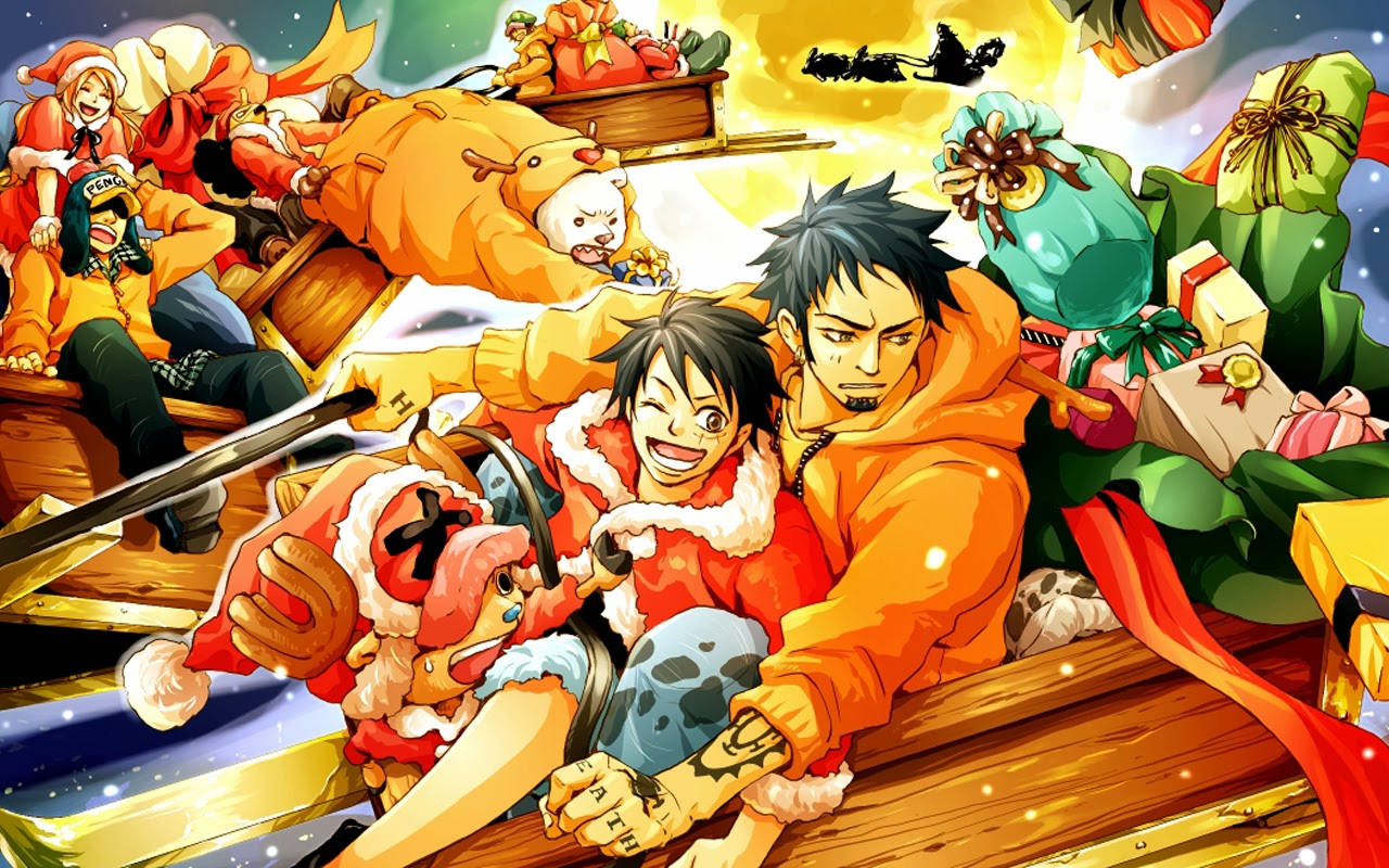 Description: A group of anime characters on a boat in the snow with santa claus and other characters in the background.