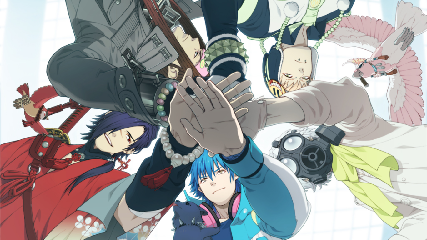 Description: A group of anime characters standing together in a circle with their hands up in the air and their faces slightly obscured by the background.