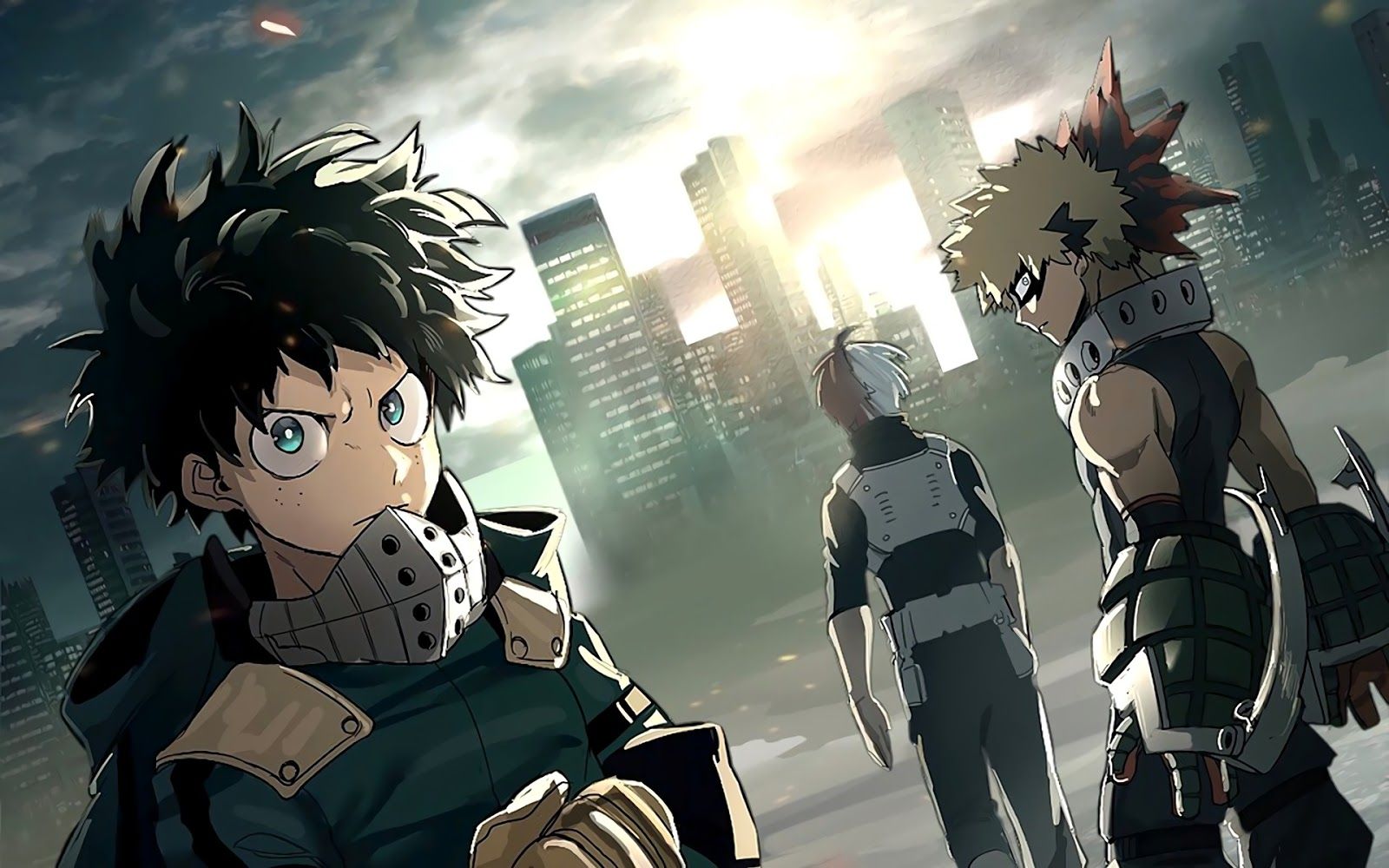Description: Two anime characters standing in front of a city skyline with buildings in the background and a person with a gun in his hand.