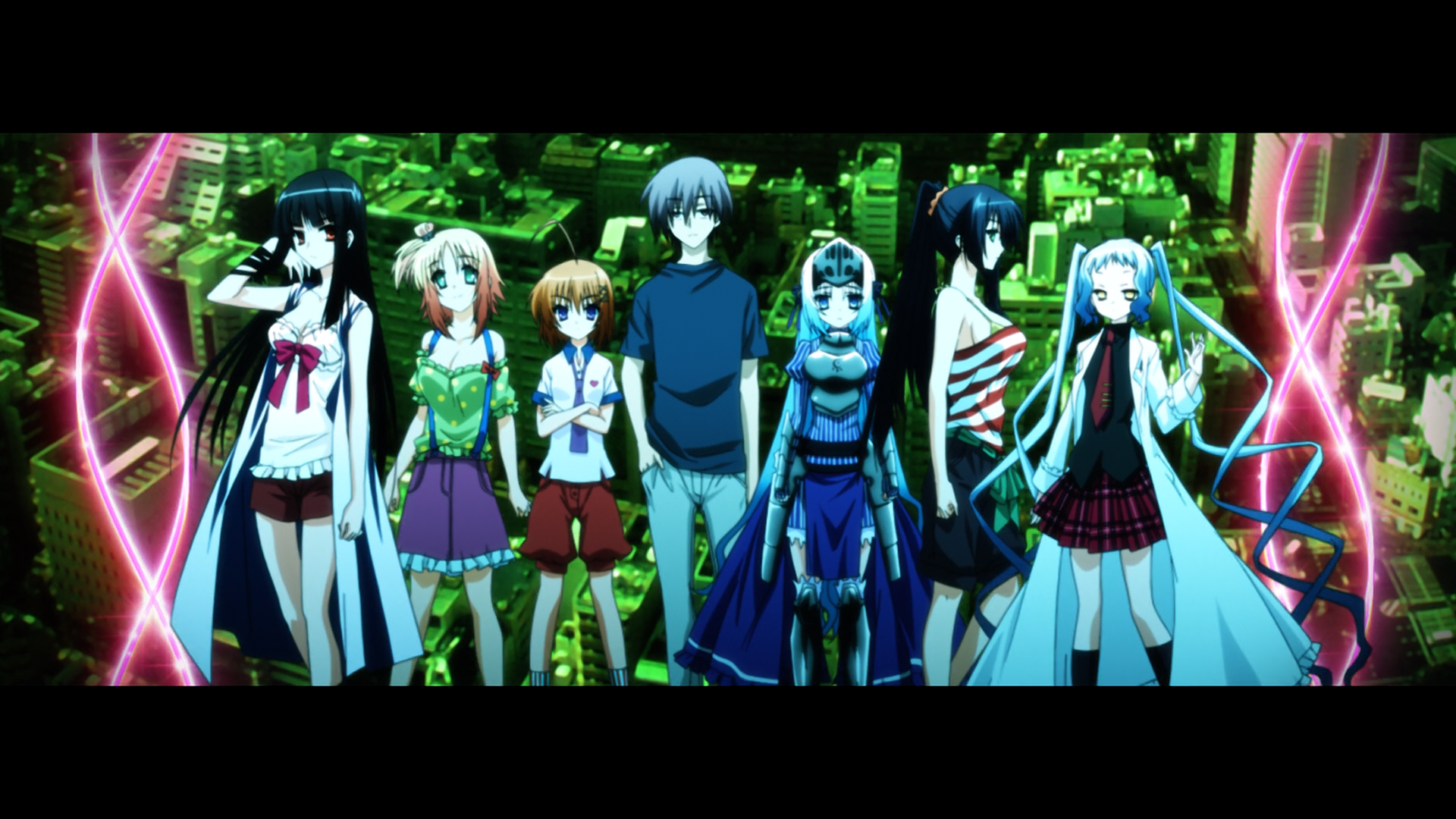 Description: A group of anime characters standing in front of a cityscape with neon lights in the background and a neon light in the foreground.