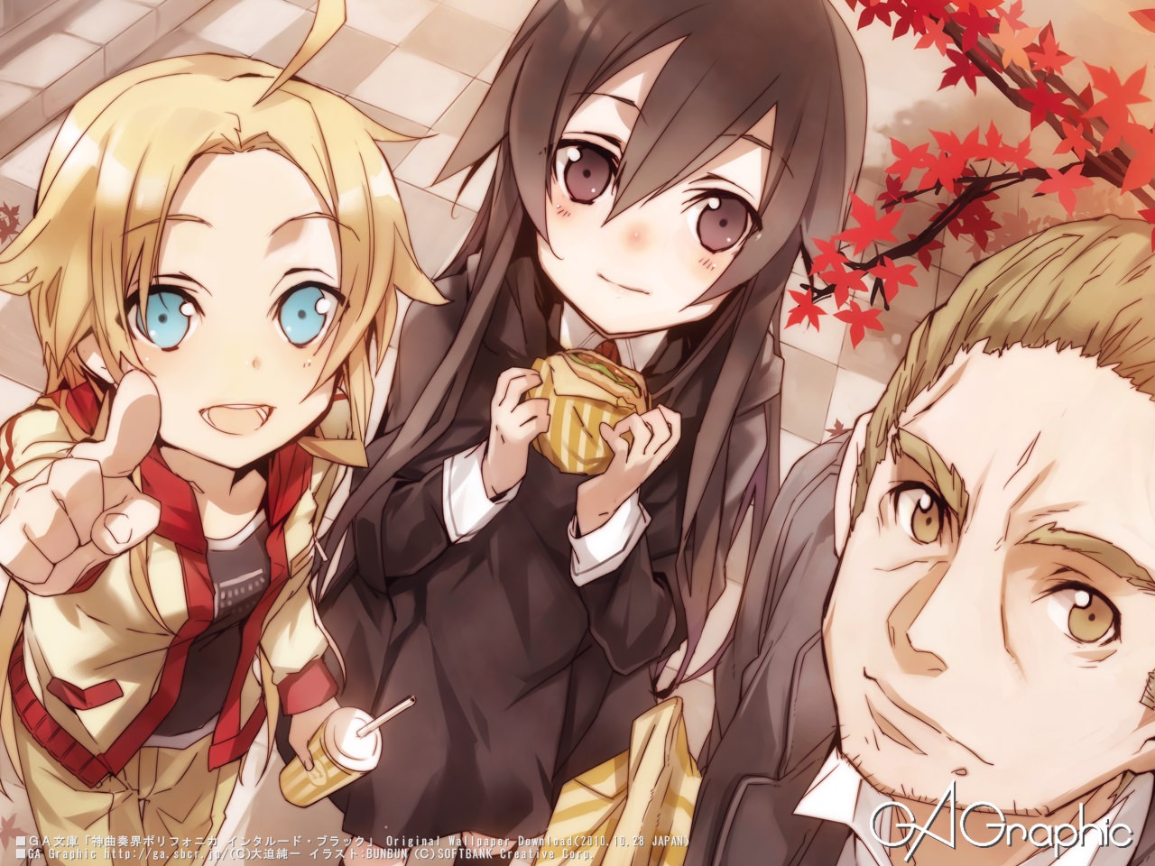 Description: Three anime characters are standing together and one is holding a cup of coffee and the other is pointing at something.