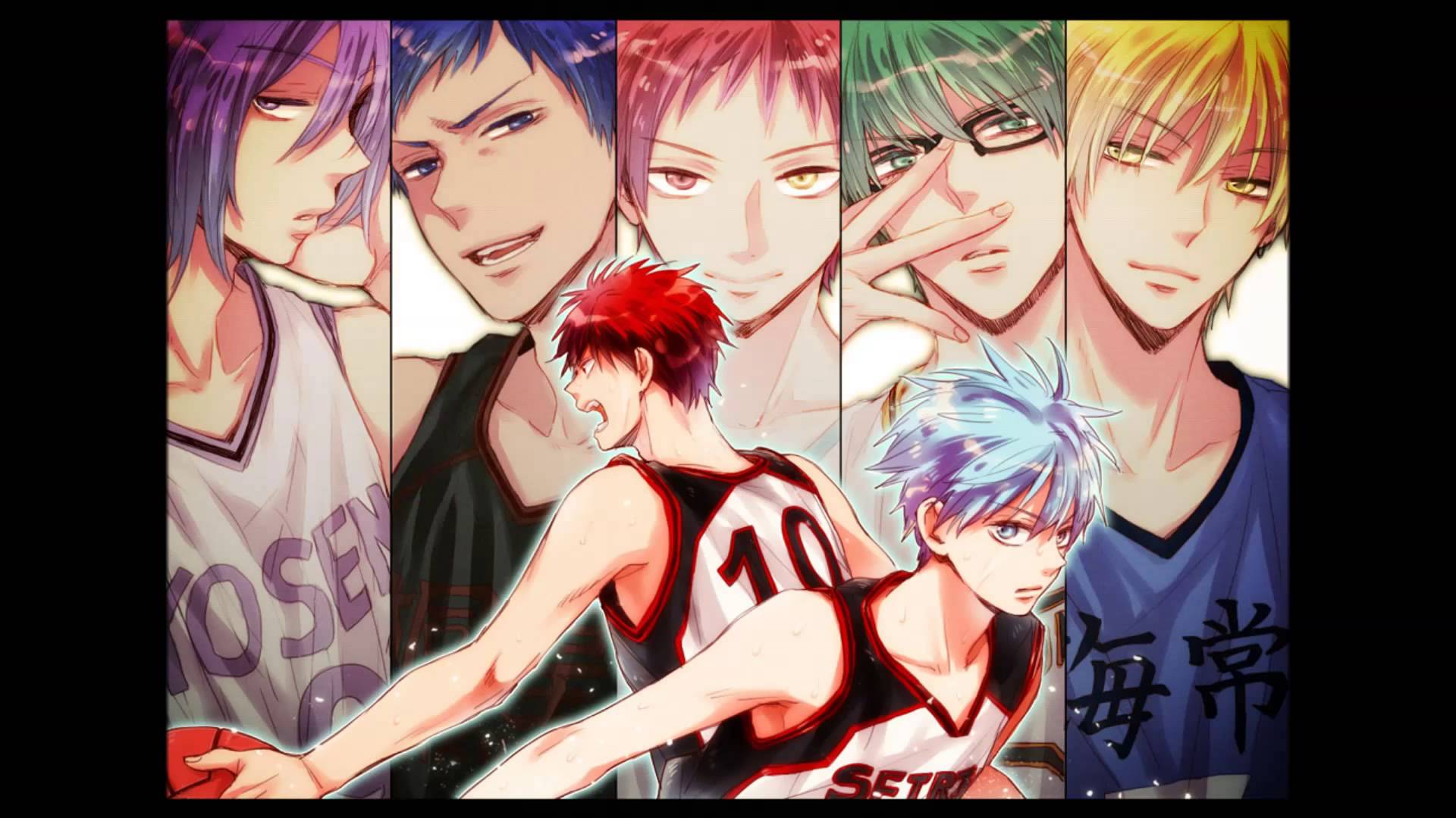 Description: A group of anime characters with different colored hair and glasses on their faces.