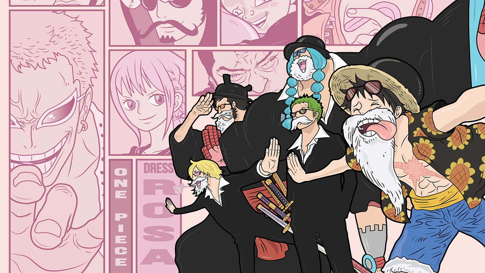 Description: A group of anime characters standing in front of a wall of comic books and pictures of them with their hands up.