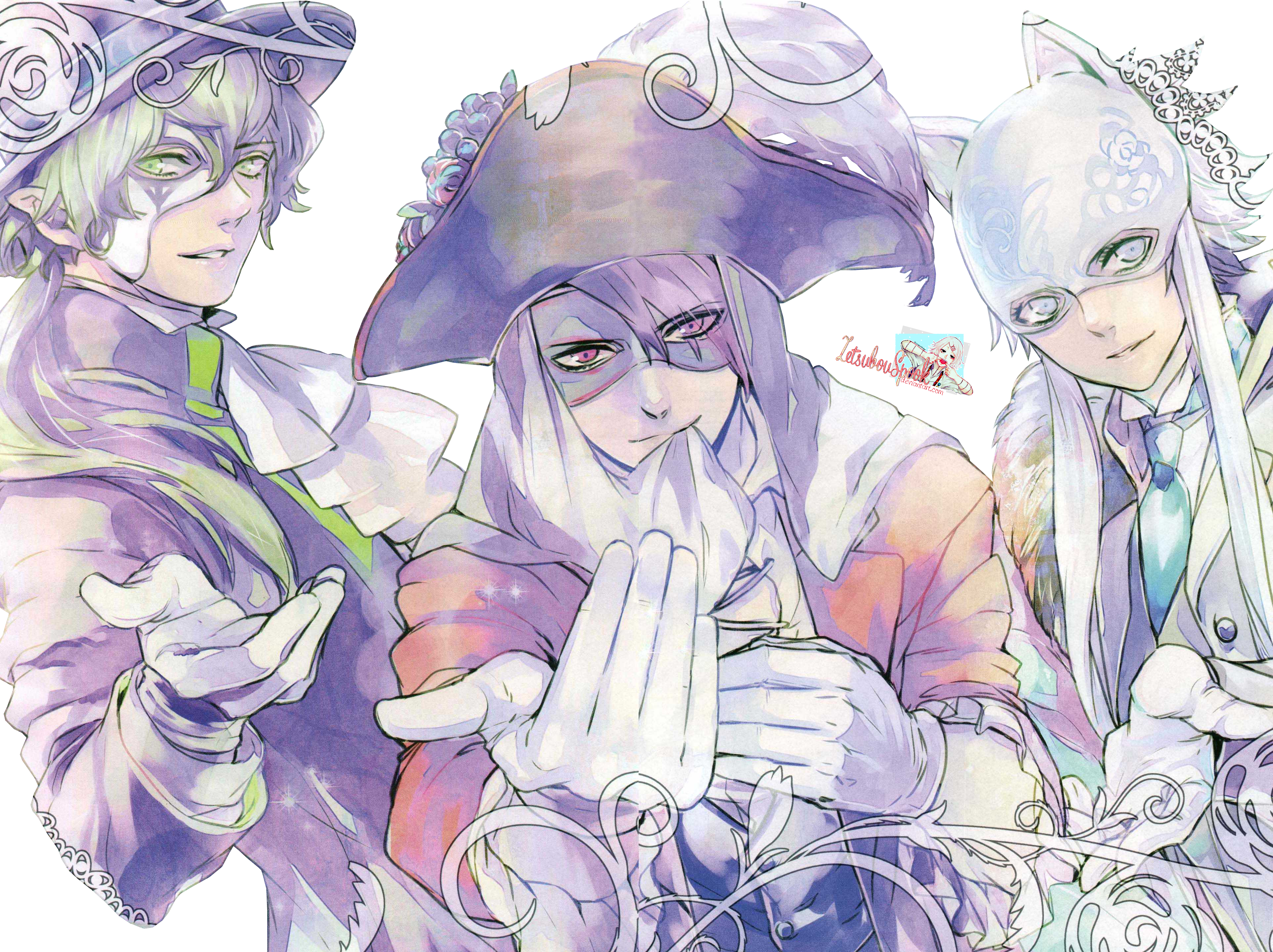 Description: Two anime characters are dressed in costumes and hats.