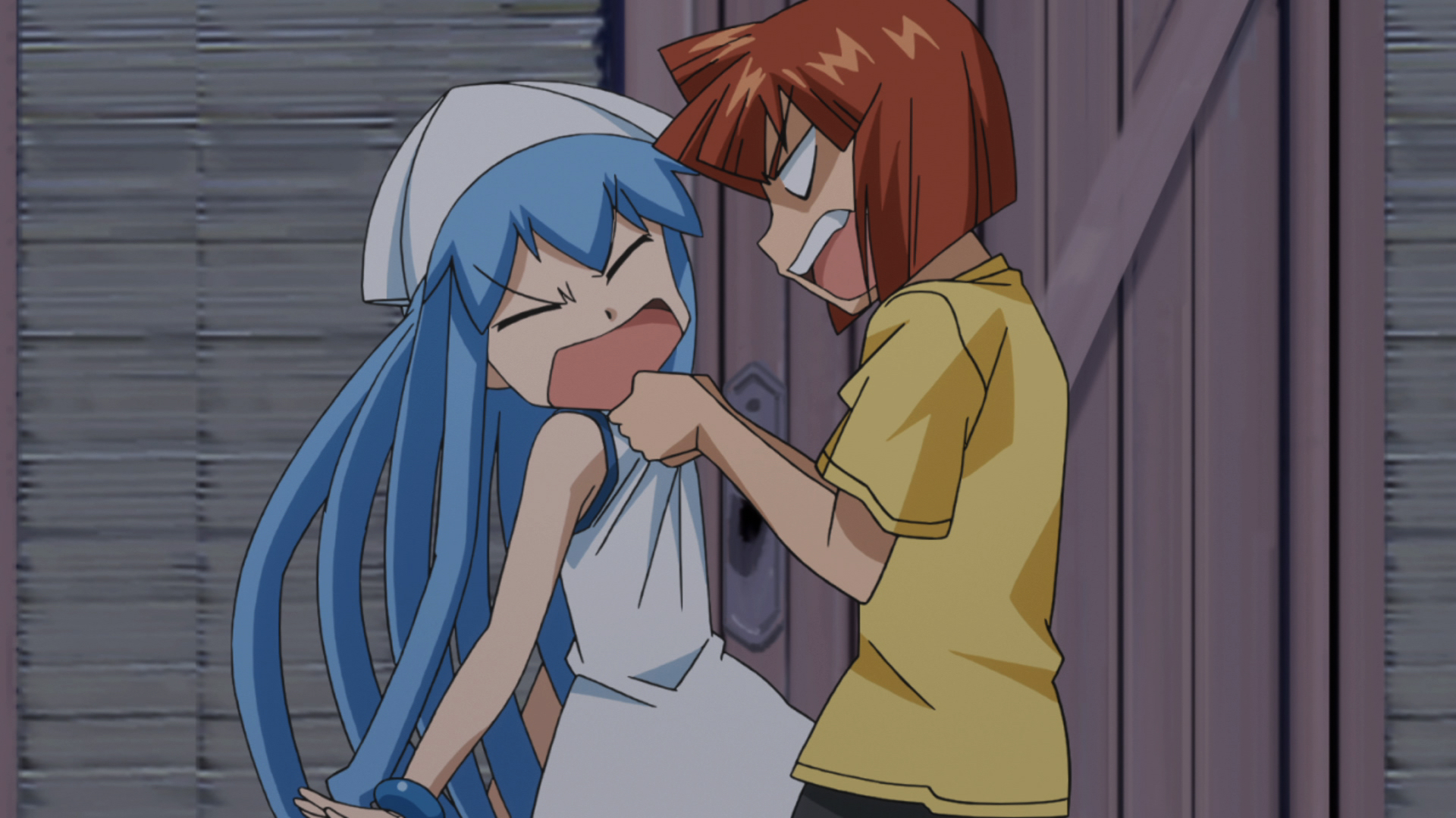 Description: A couple of anime characters standing next to each other in a room with a door open and a curtain open.