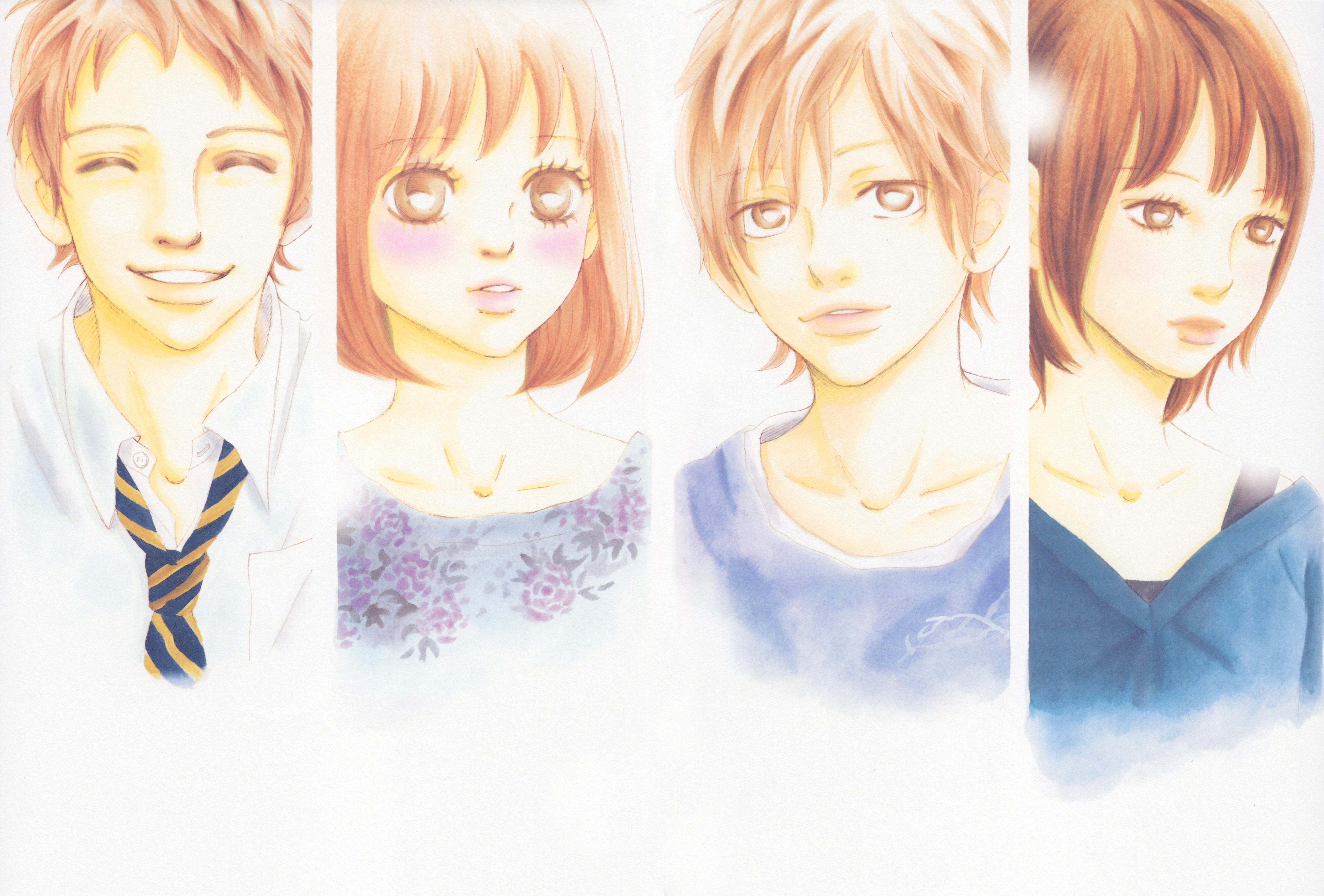 Description: A group of three anime characters with different expressions on their faces and shoulders.