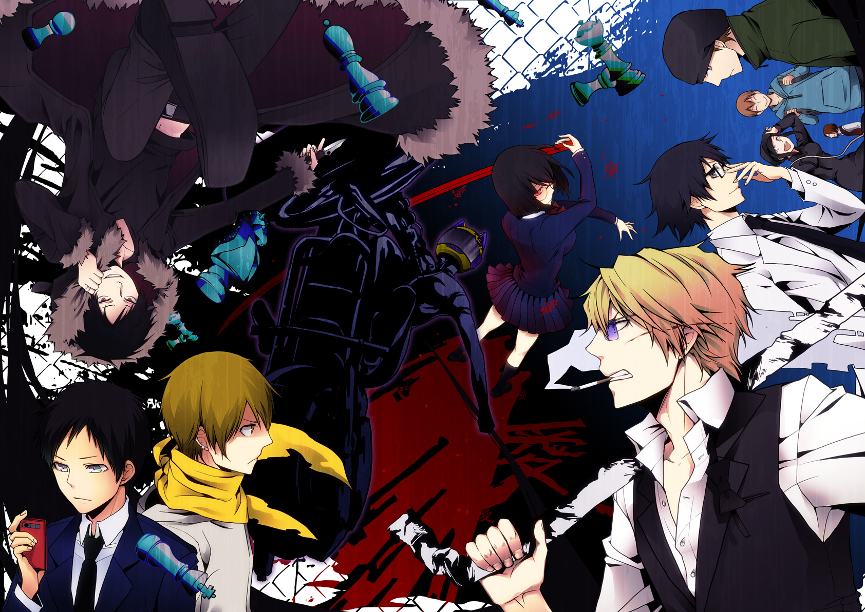 Description: A group of anime characters standing in front of a fence with a robot in the background and a man in the foreground.