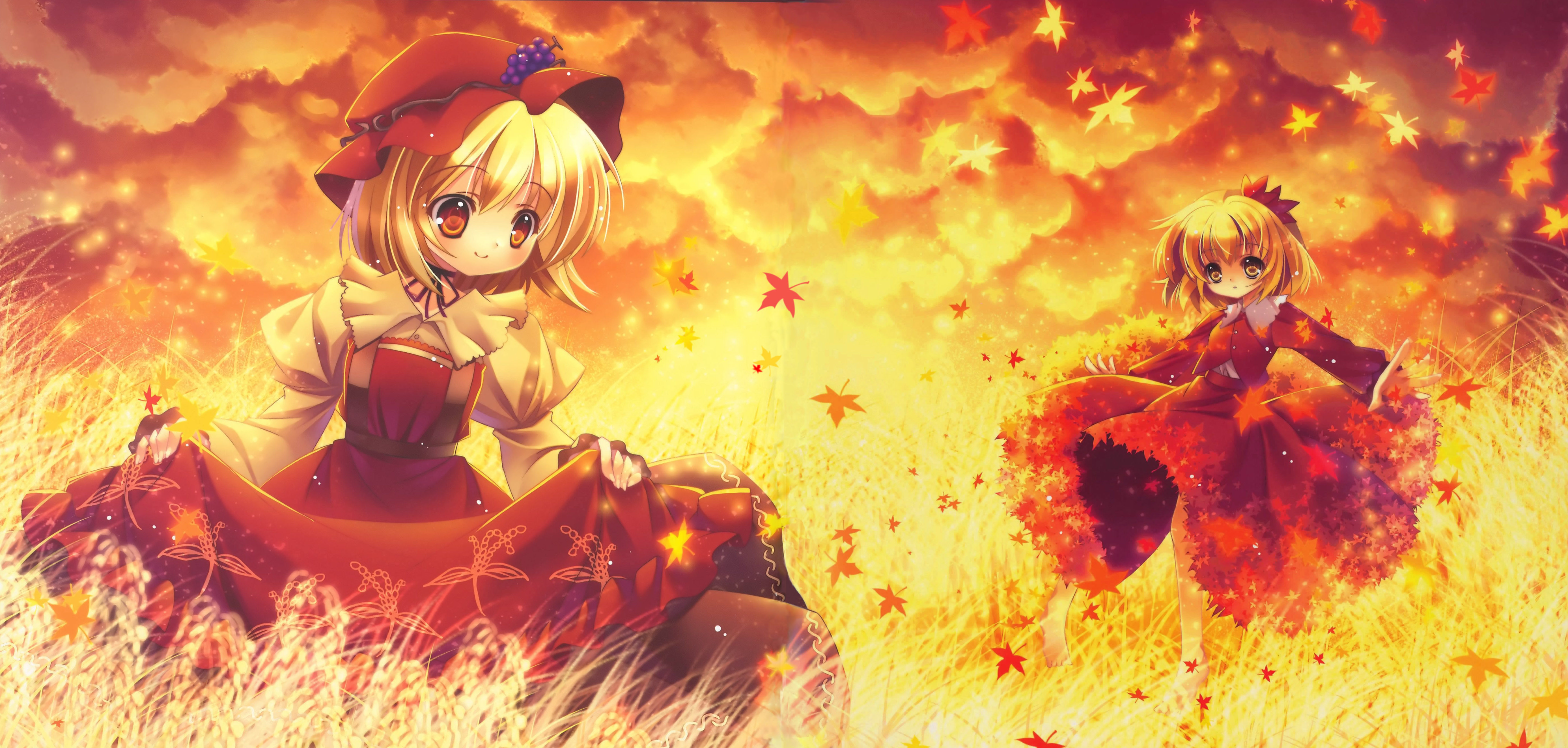 Description: Two anime characters sitting in a field of grass with fire in the background and a sky full of stars.