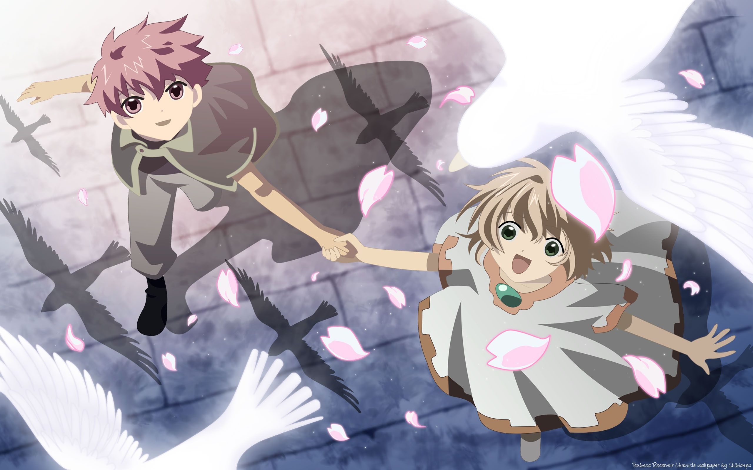 Description: A couple of anime characters flying through the air with a bird nearby on a wall with pink petals on it.