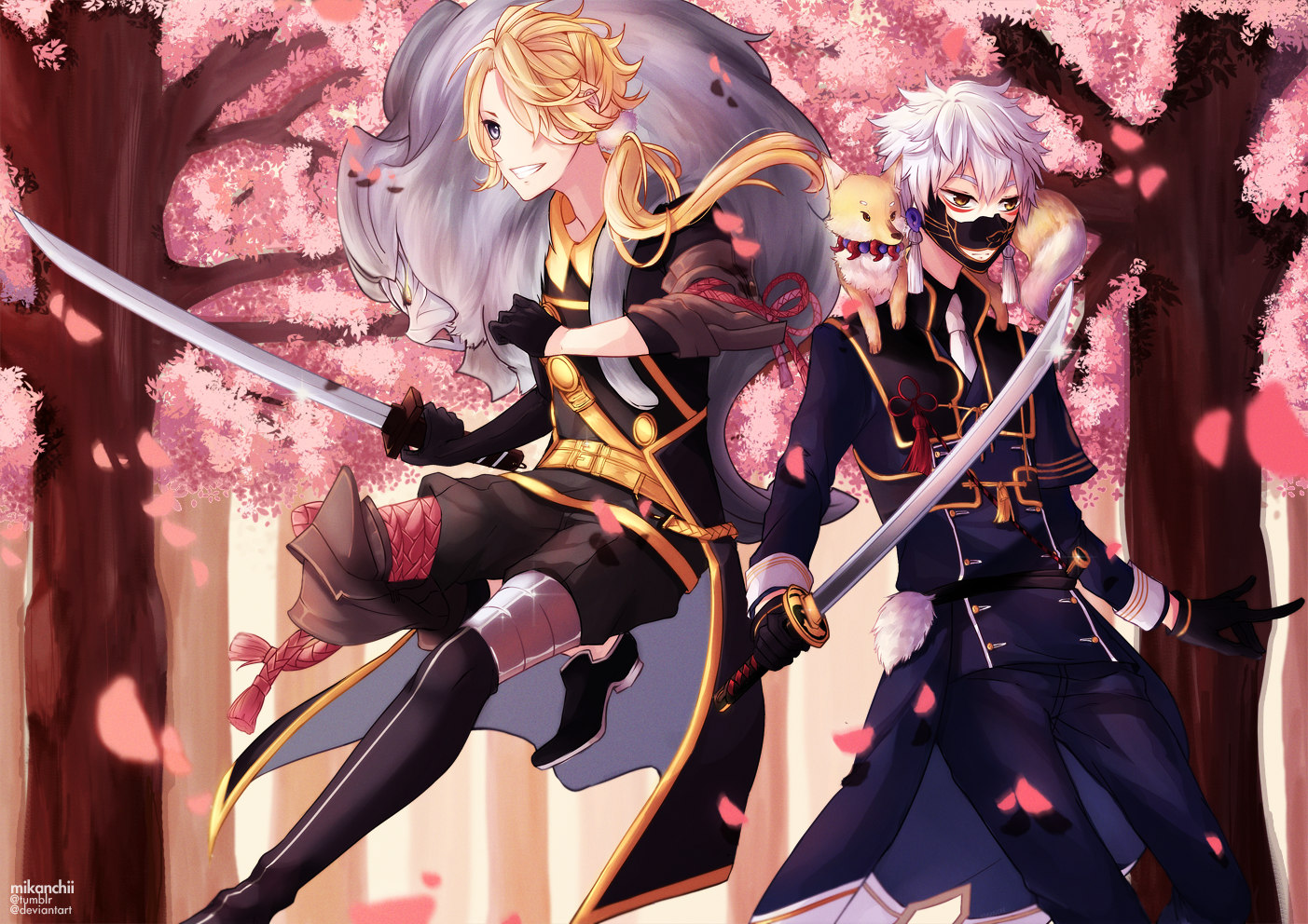 Description: Two anime characters in a forest with pink flowers and trees in the background.