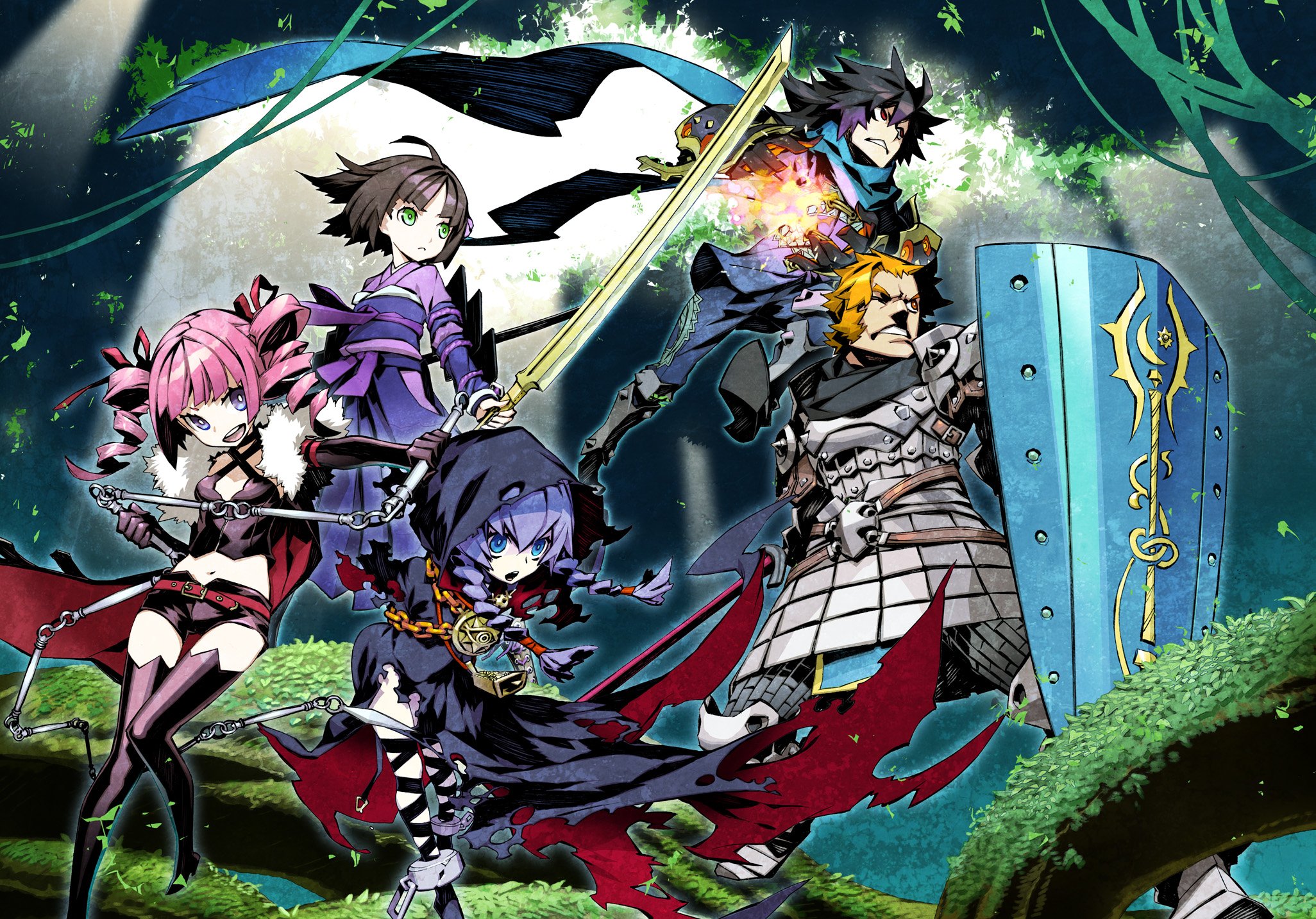 Description: A group of anime characters standing next to each other in a forest with a sword in their hand and a shield in their hand.