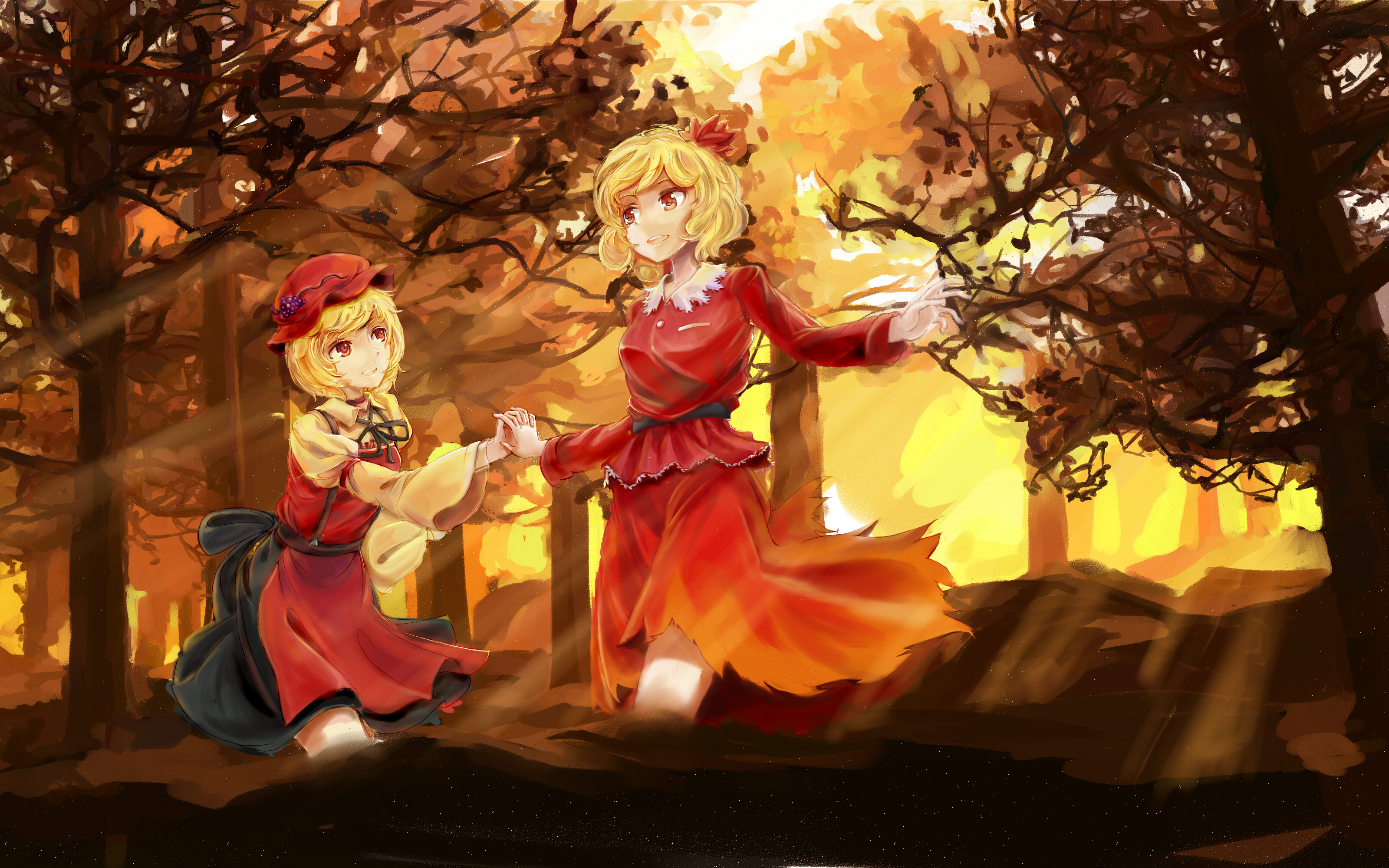 Description: Two anime characters in a forest with trees in the background and a fire in the background.