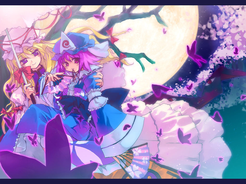 Description: A couple of anime characters standing next to each other in front of a full moon and tree with purple leaves.